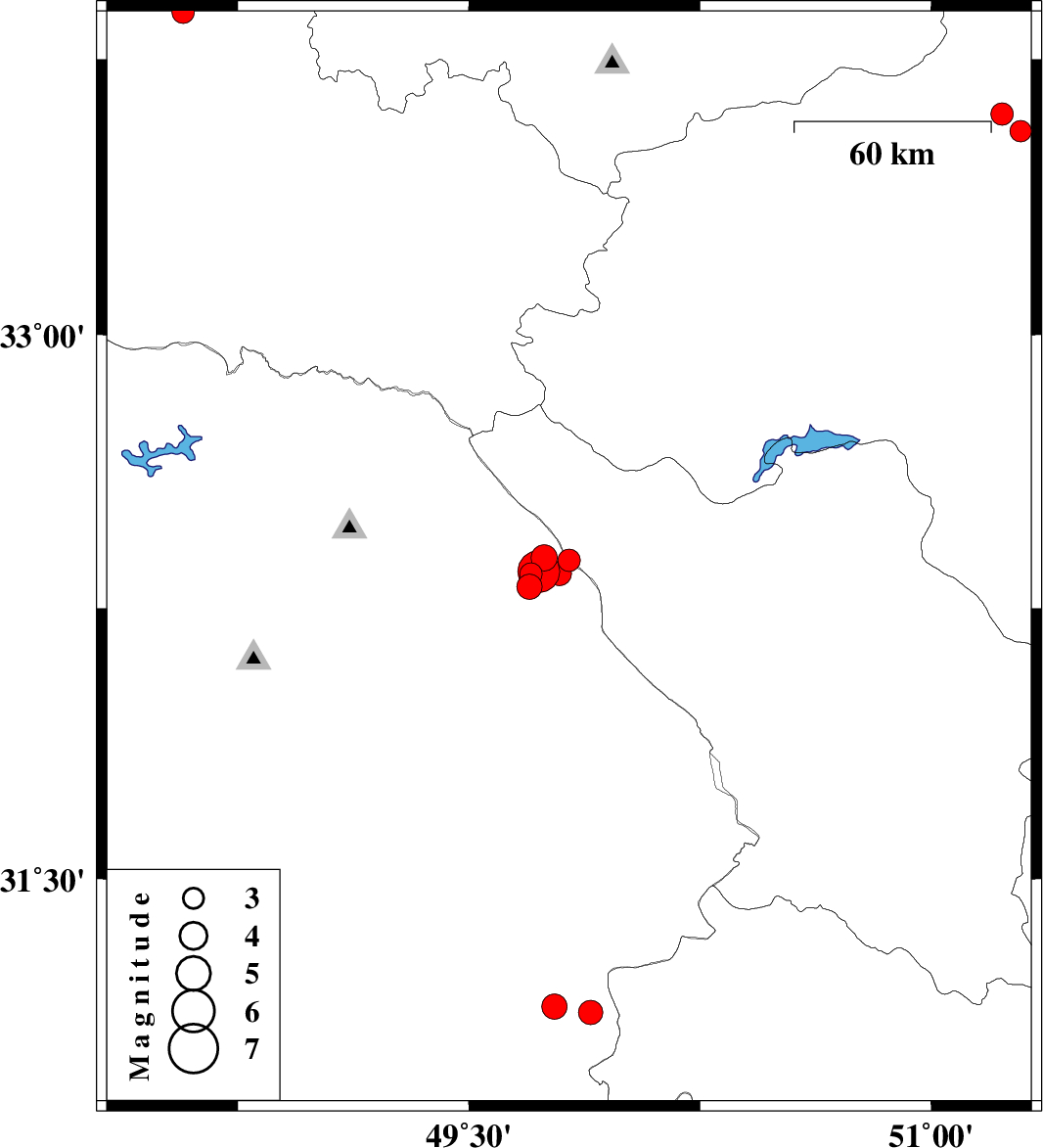 | 2021/09/11 | 02:23:18.2 | 06:53:18.2 | 33.602 | 51.23 | 12 | ML3.2 | Esfahan Province, 47 km South-West of Kashan | ||