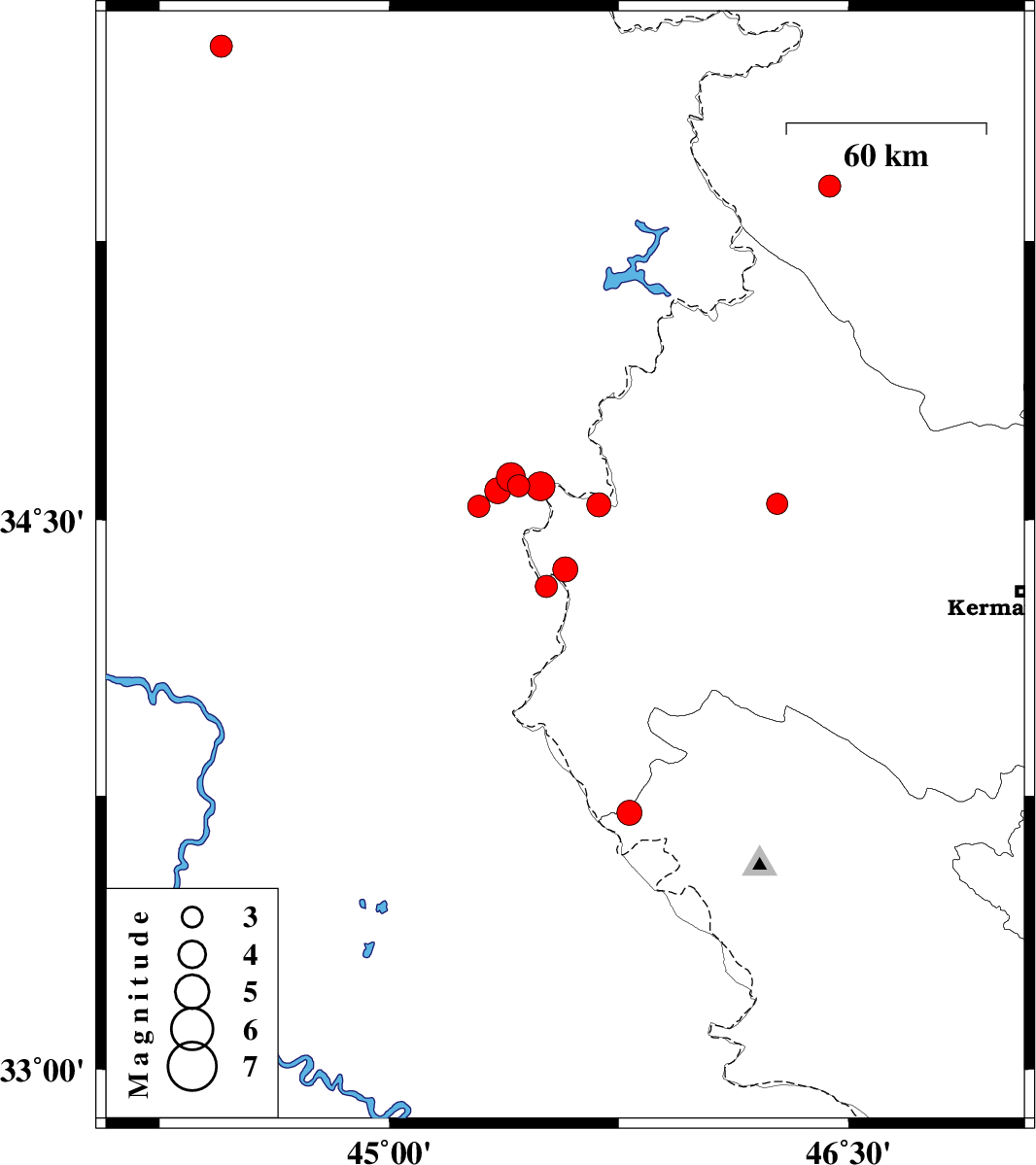 | 2021/09/14 | 09:33:21.3 | 14:03:21.3 | 34.54 | 45.684 | 12 | ML3.5 | Kermanshah Province, 10 km -East of Qasr-E-Shirin |