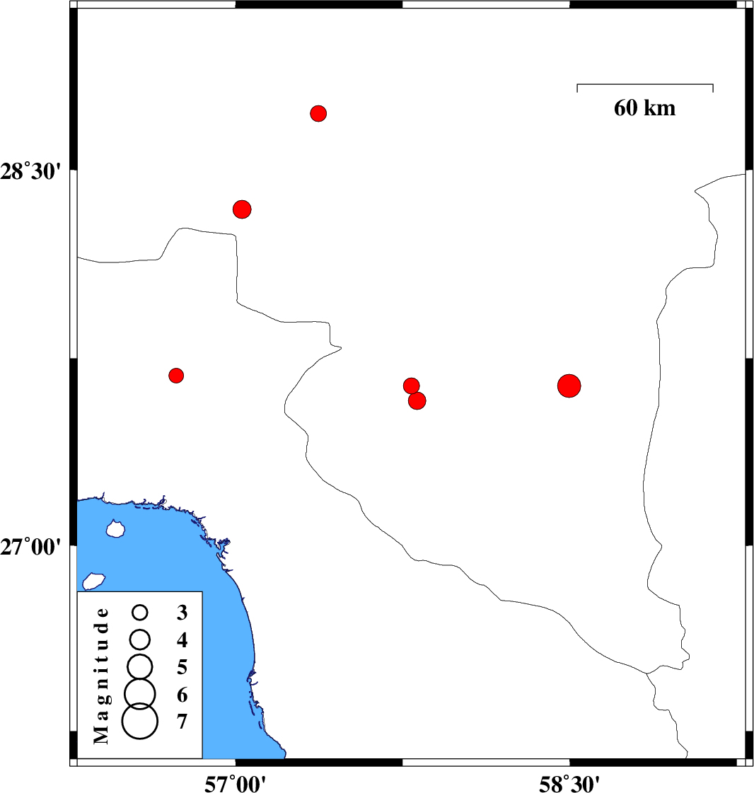 | 2021/10/21 | 06:05:14.8 | 09:35:14.8 | 27.639 | 58.498 | 12 | ML4.7 | Kerman Province, 86 km South-East of Kahnuj | ||