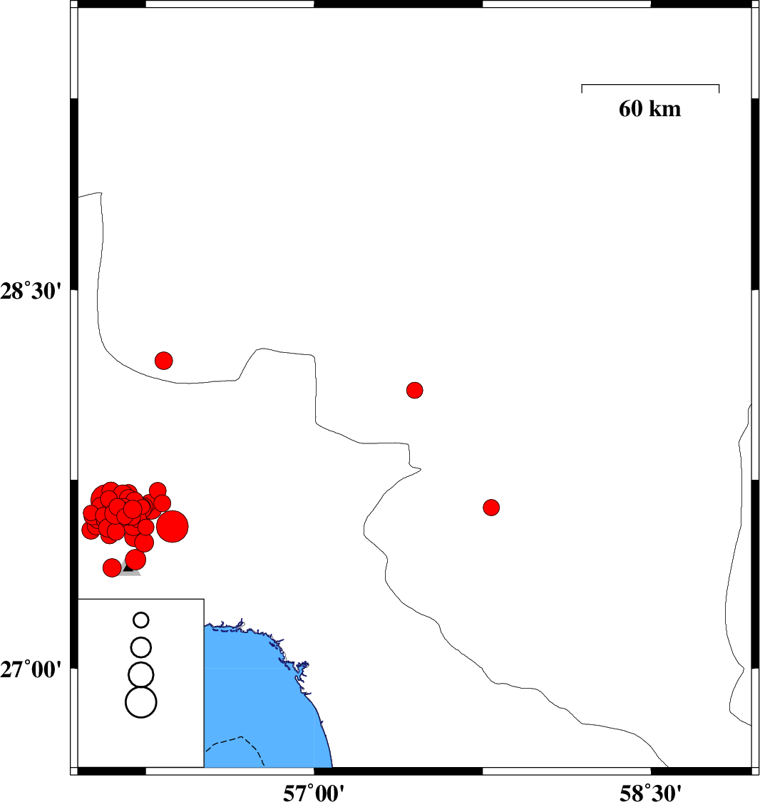 | 2021/11/11 | 21:36:55.9 | 01:06:55.9 | 27.639 | 57.789 | 14 | ML3.3 | Kerman Province, 36 km South of Kahnuj |