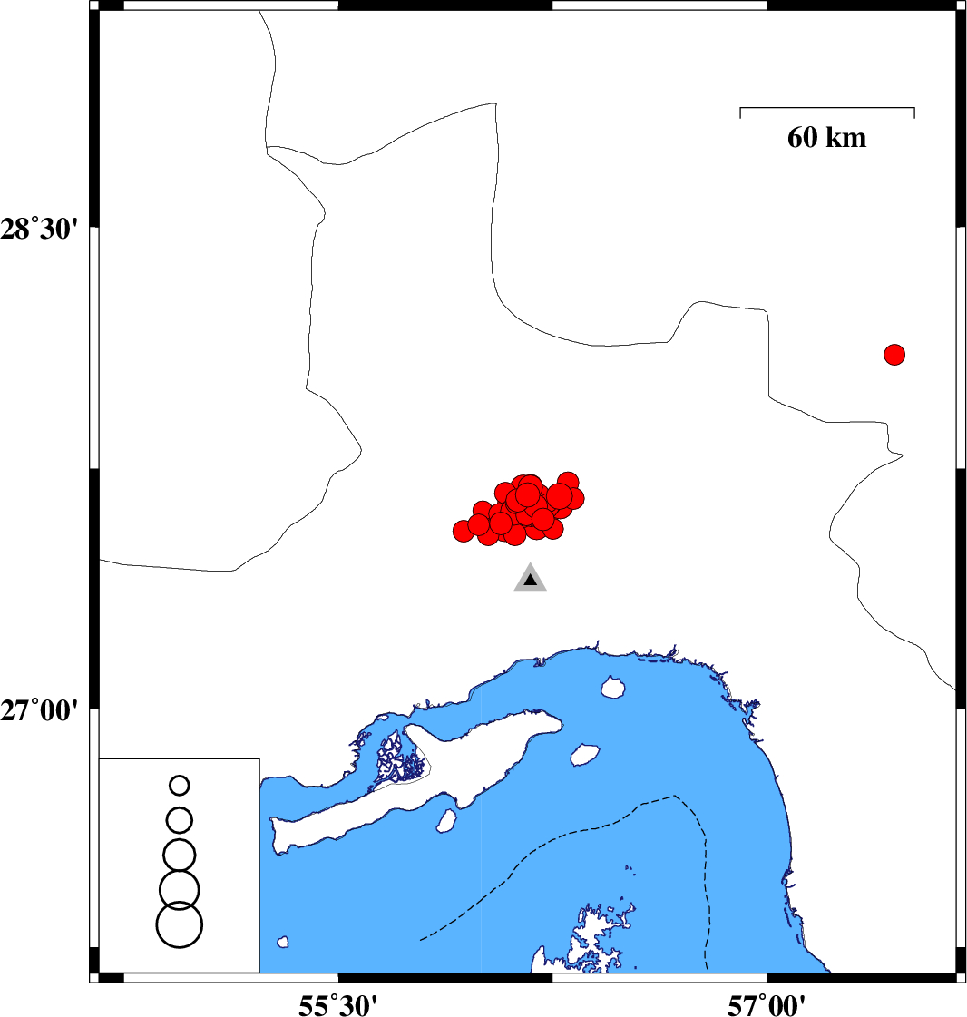 | 2021/11/15 | 01:41:27.3 | 05:11:27.3 | 27.555 | 55.938 | 12 | ML3.4 | Hormozgan Province, 53 km North-West of Bandar-e abbas |