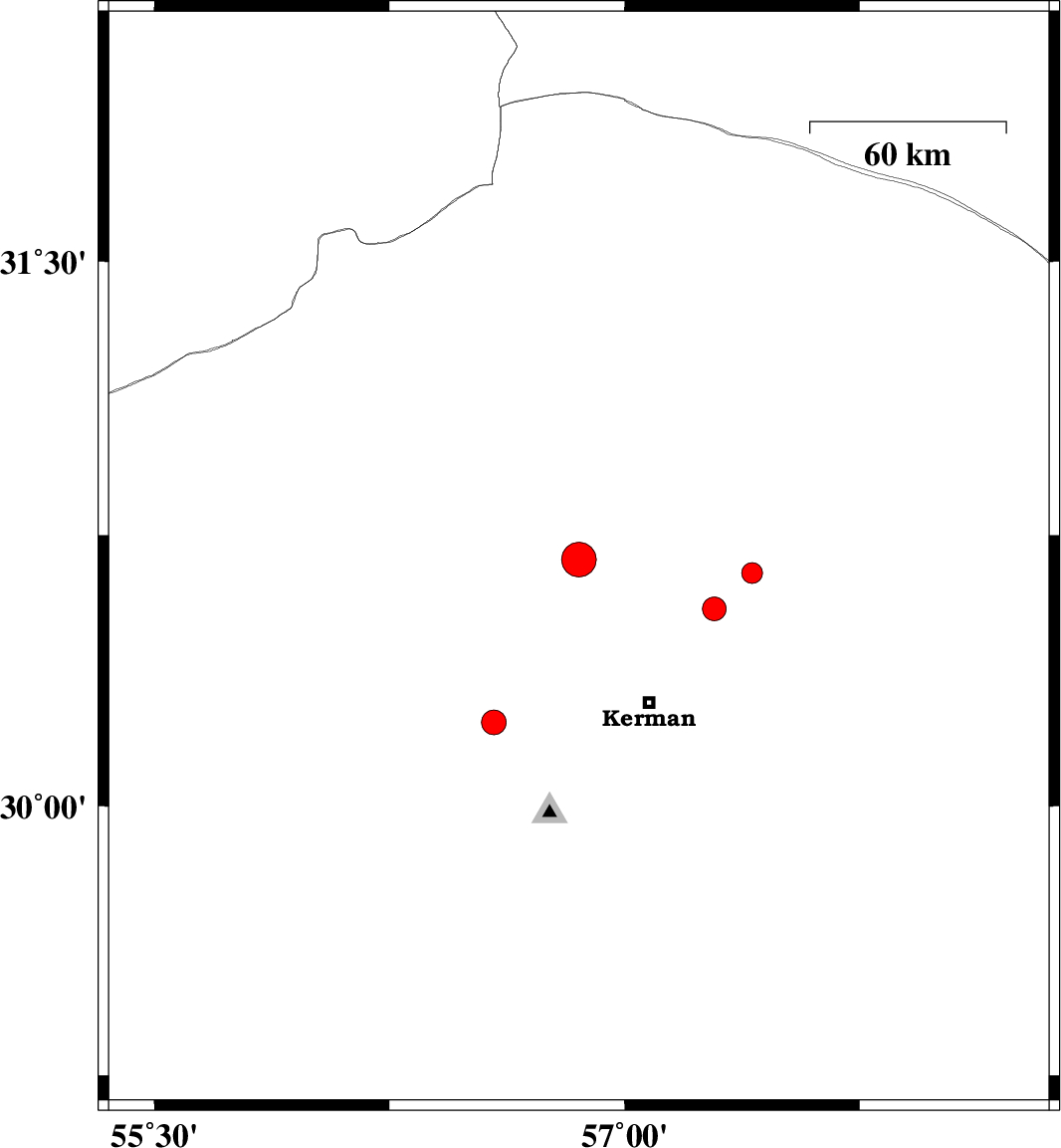 | 2021/11/17 | 16:50:23.2 | 20:20:23.2 | 30.233 | 56.582 | 12 | ML3.5 | Kerman Province, 34 km North of Bardsir |
