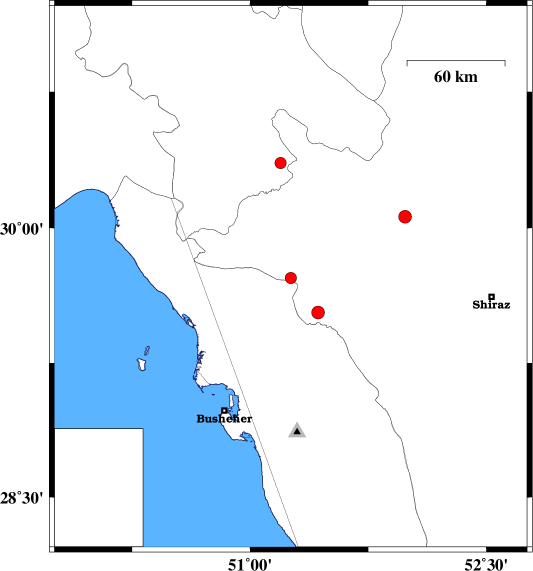 | 2021/12/22 | 00:06:23.2 | 03:36:23.2 | 29.722 | 51.258 | 12 | ML3.2 | Fars Province, 40 km North-West of Kazerun | ||