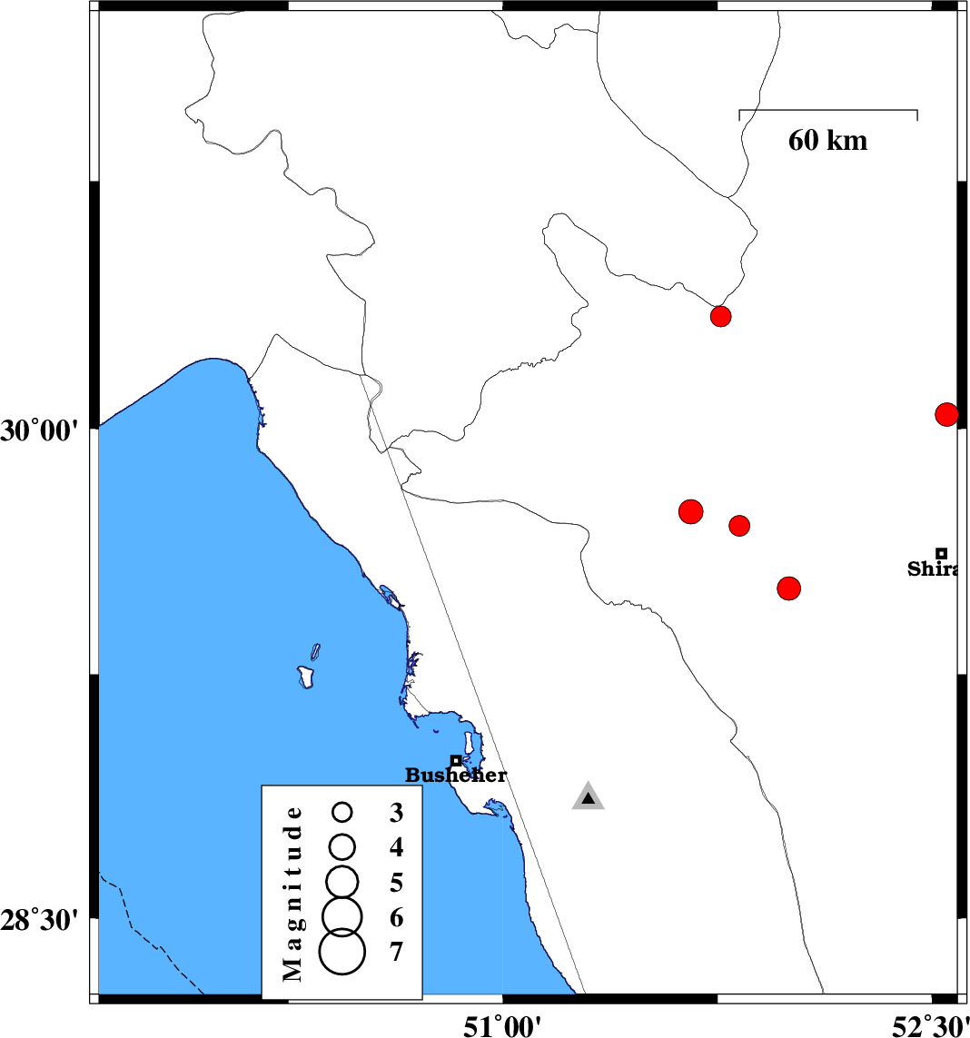 | 2021/12/24 | 21:39:37.3 | 01:09:37.3 | 29.765 | 51.088 | 12 | ML3.8 | Fars Province, 57 km North-West of Borazjan | ||