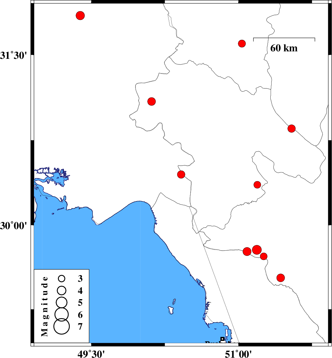 | 2021/12/22 | 00:06:23.2 | 03:36:23.2 | 29.722 | 51.258 | 12 | ML3.2 | Fars Province, 40 km North-West of Kazerun | ||