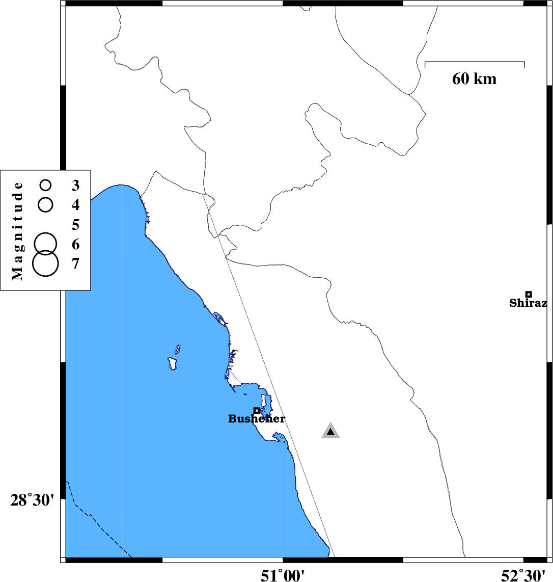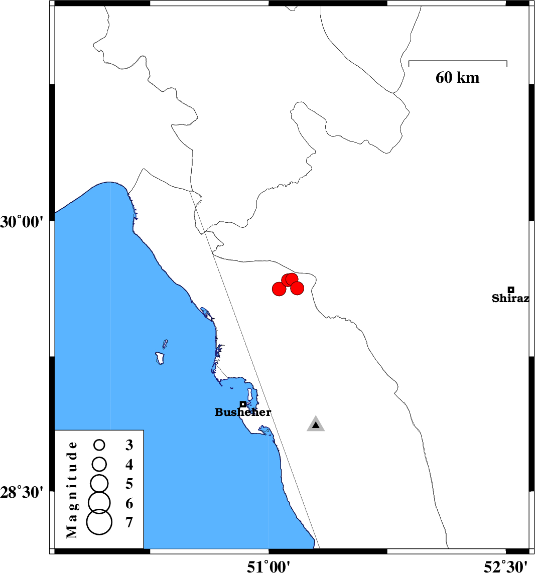 | 2022/01/10 | 18:31:26.7 | 22:01:26.7 | 29.628 | 51.18 | 10 | ML3.8 | Bushehr Province, 41 km North of Borazjan | ||