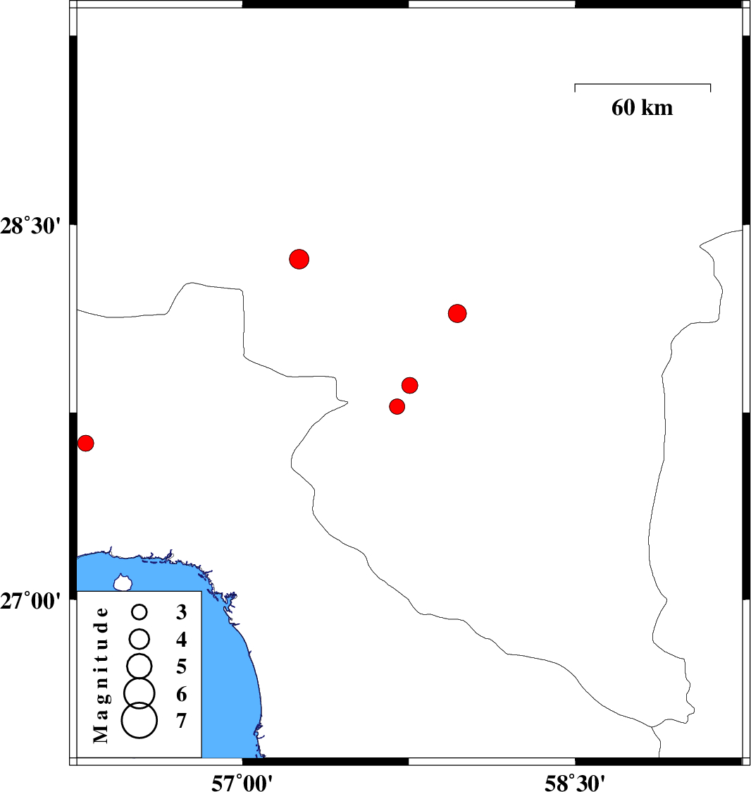 | 2022/01/11 | 01:58:06.2 | 05:28:06.2 | 27.859 | 57.754 | 12 | ML3.2 | Kerman Province, 12 km of Kahnuj | ||