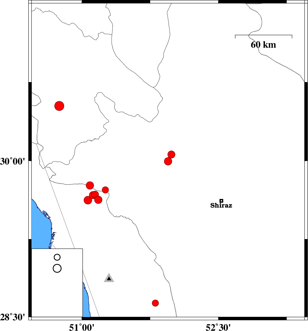 | 2021/12/22 | 00:06:23.2 | 03:36:23.2 | 29.722 | 51.258 | 12 | ML3.2 | Fars Province, 40 km North-West of Kazerun |