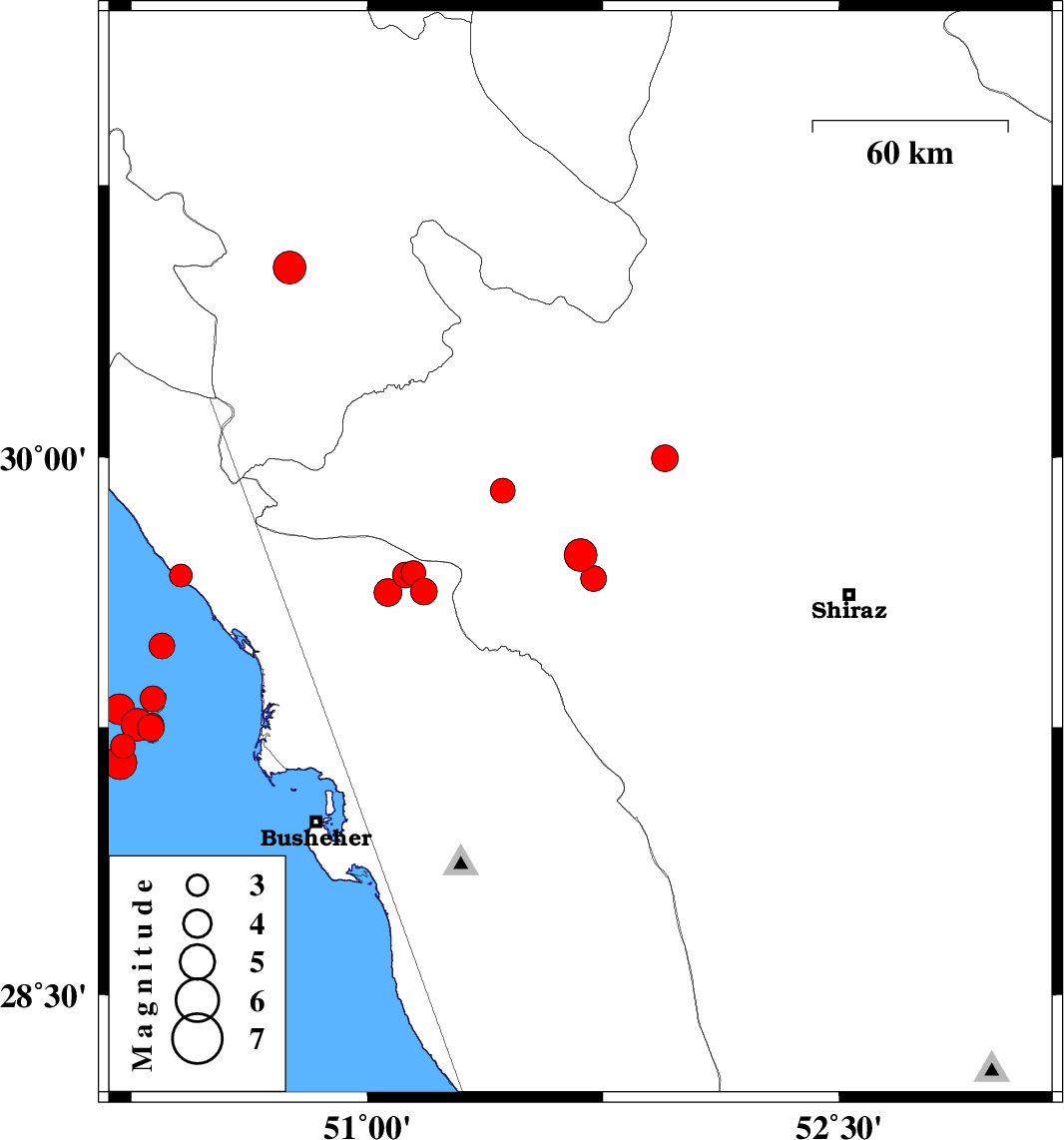 | 2022/01/16 | 02:49:20.2 | 06:19:20.2 | 29.151 | 50.213 | 12 | ML4.8 | Persian Gulf, 55 km South-West of Bandar-e genaveh | ||