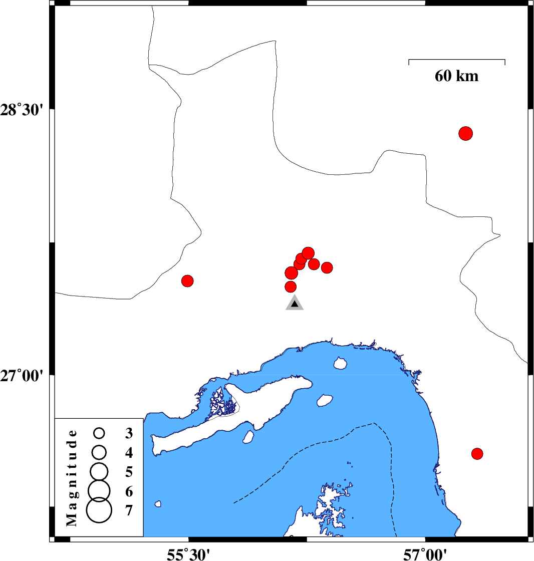 | 2022/01/18 | 00:07:42.7 | 03:37:42.7 | 26.552 | 57.329 | 12 | ML3.2 | Hormozgan Province, 71 km South-East of Minab | ||