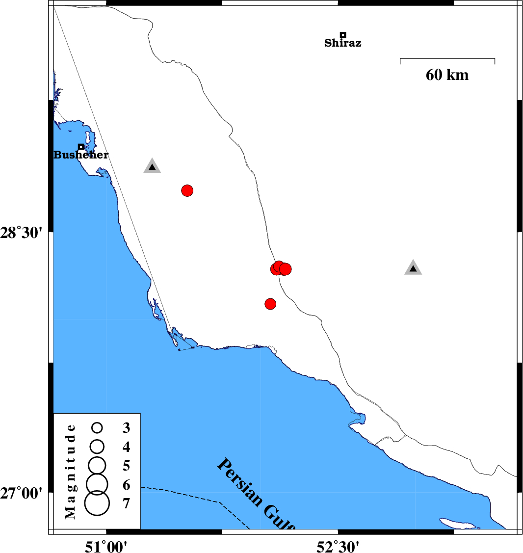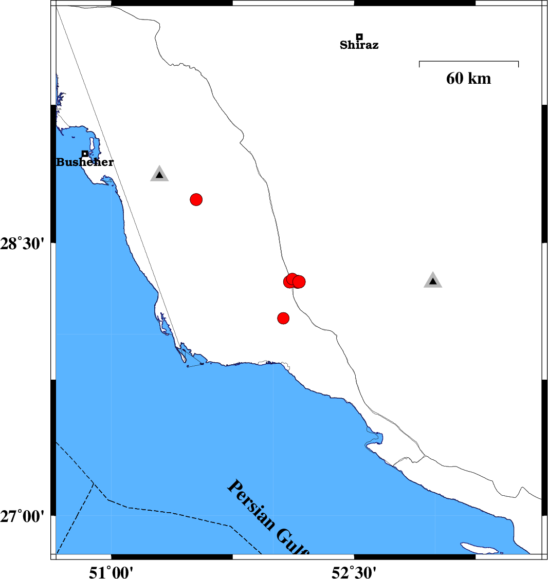 | 2022/02/16 | 04:45:30.8 | 08:15:30.8 | 28.287 | 52.149 | 12 | ML3.7 | Fars Province, 52 km North of Bandar-e kangan |