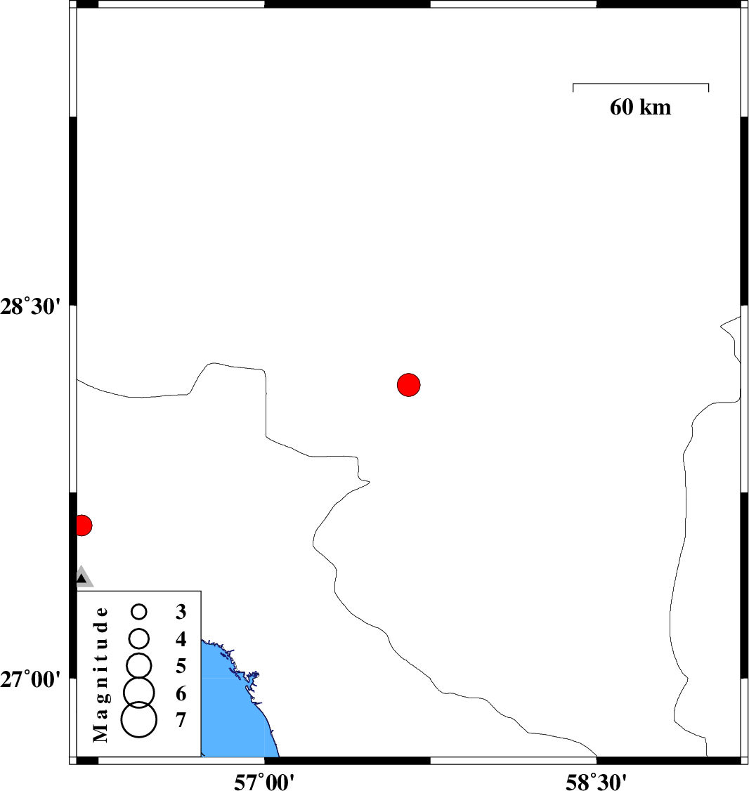 | 2022/03/02 | 03:06:59.3 | 06:36:59.3 | 28.181 | 57.651 | 10 | ML4.6 | Kerman Province, 26 km North of Kahnuj | ||