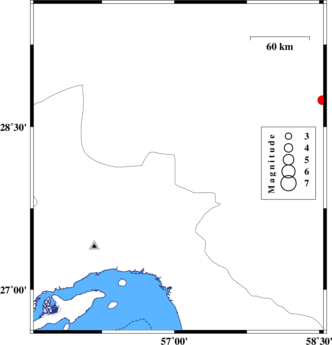 | 2022/03/02 | 03:06:59.3 | 06:36:59.3 | 28.181 | 57.651 | 10 | ML4.6 | Kerman Province, 26 km North of Kahnuj |