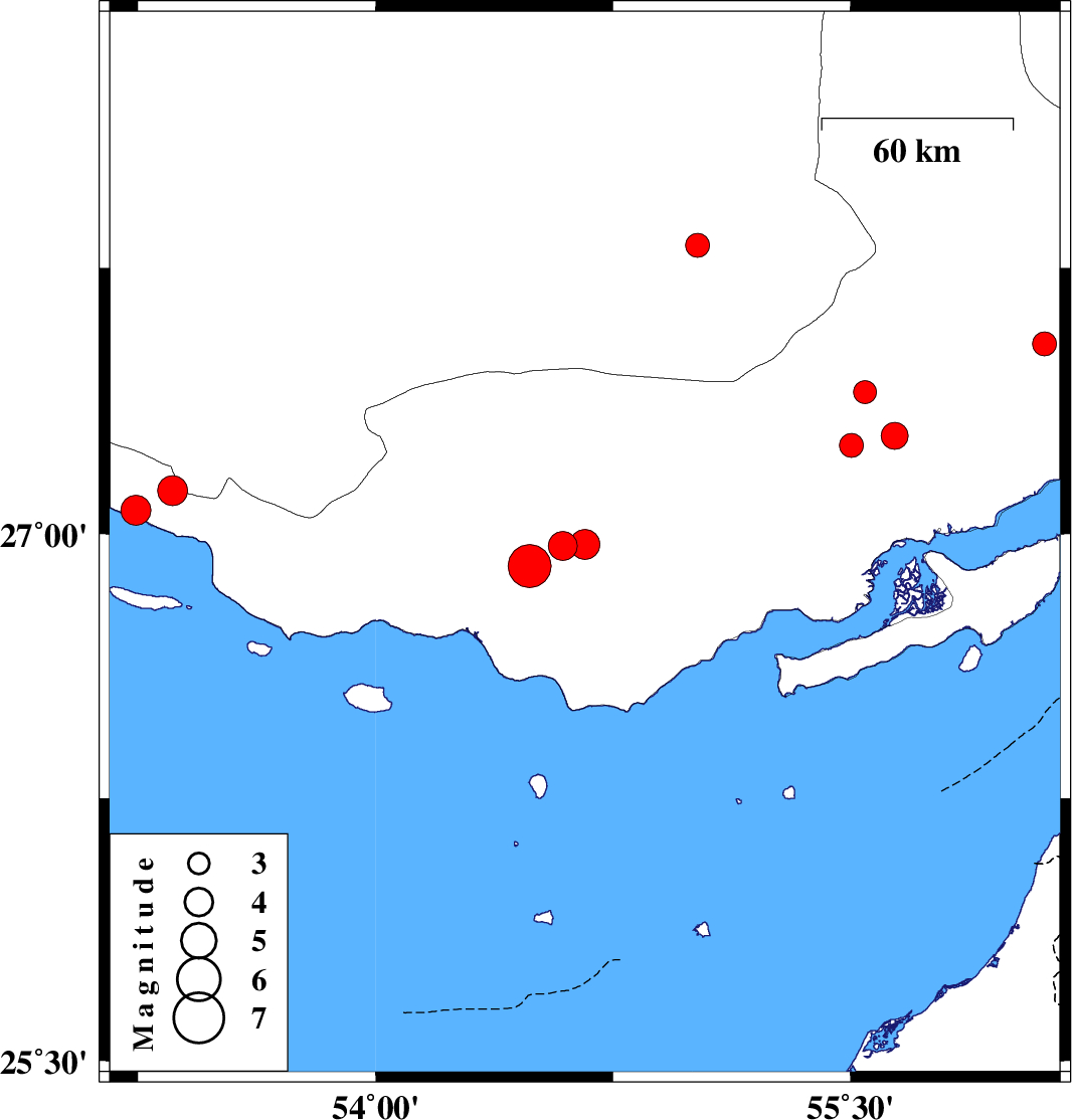 | 2022/03/04 | 10:46:13.9 | 14:16:13.9 | 27.122 | 53.36 | 12 | ML4.3 | Hormozgan Province, 30 km South-East of Lamerd | ||