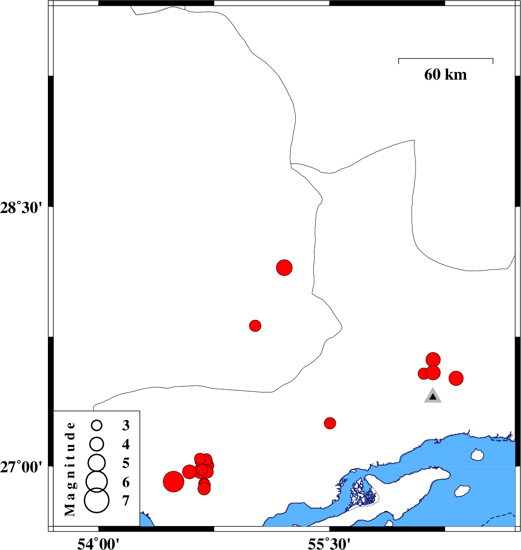 | 2022/03/17 | 02:45:04.9 | 06:15:04.9 | 27.004 | 54.708 | 27 | ML3.7 | Hormozgan Province, 40 km South-East of Bastak | ||