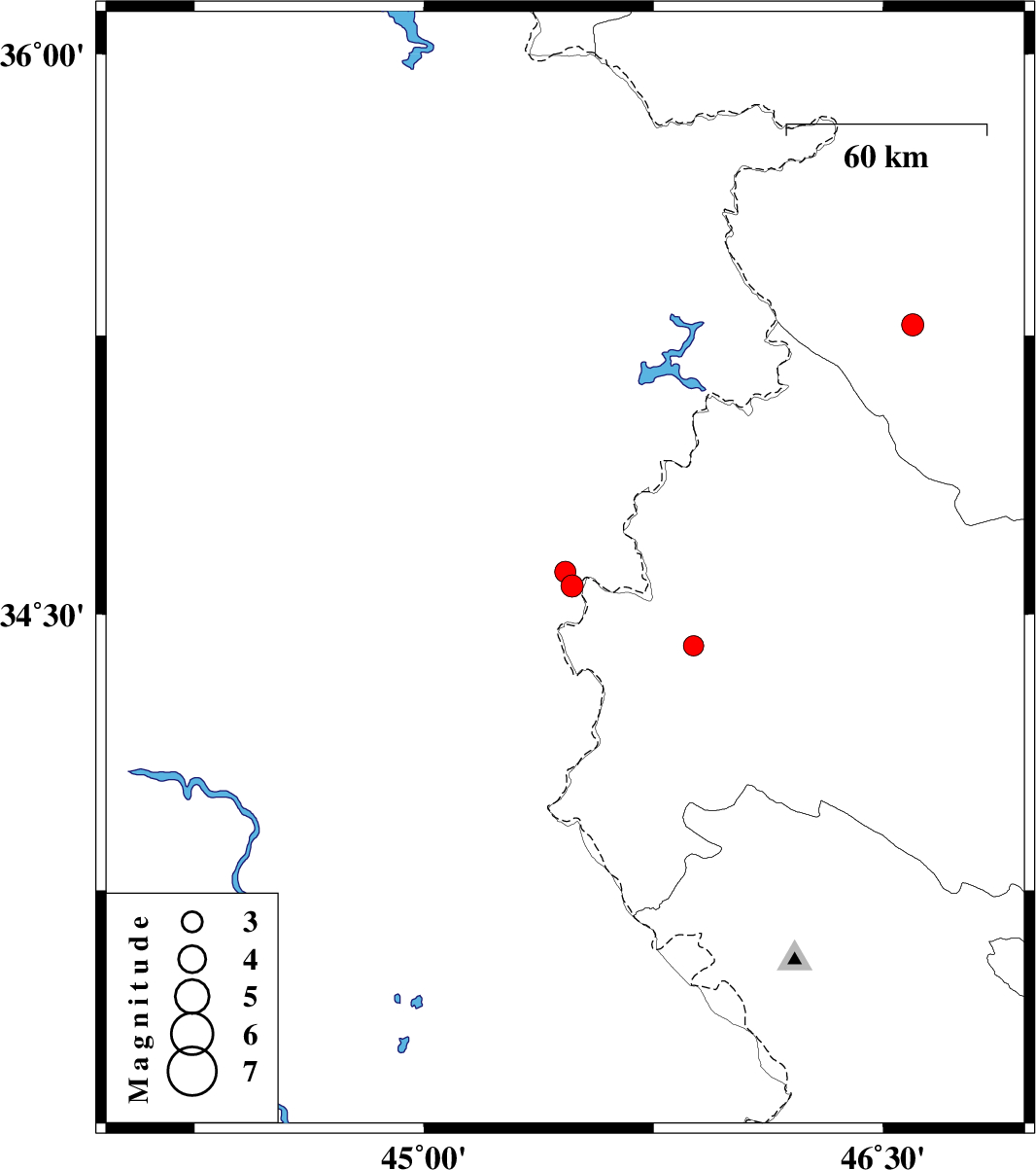 | 2022/04/02 | 12:05:45.0 | 16:35:45.0 | 34.576 | 45.483 | 12 | ML3.2 | Iraq, 11 km -West of Qasr-E-Shirin | ||