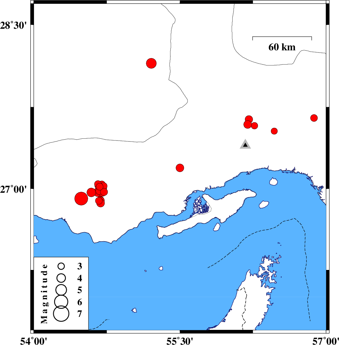 | 2022/03/17 | 02:45:04.9 | 06:15:04.9 | 27.004 | 54.708 | 27 | ML3.7 | Hormozgan Province, 40 km South-East of Bastak | ||