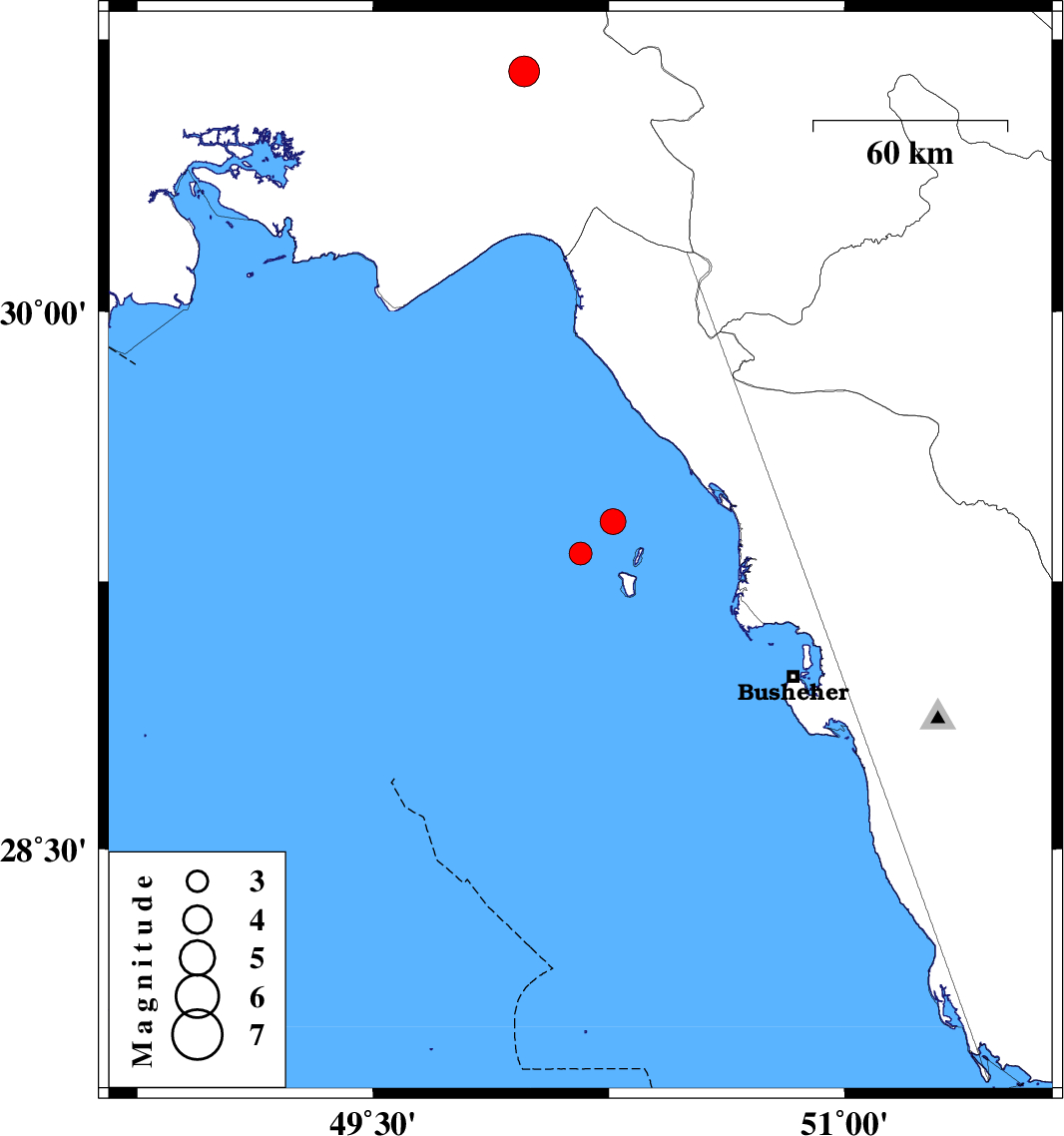 | 2022/04/11 | 08:43:44.6 | 13:13:44.6 | 29.328 | 50.16 | 9 | ML3.3 | Persian Gulf, 44 km South-West of Bandar-e genaveh | ||