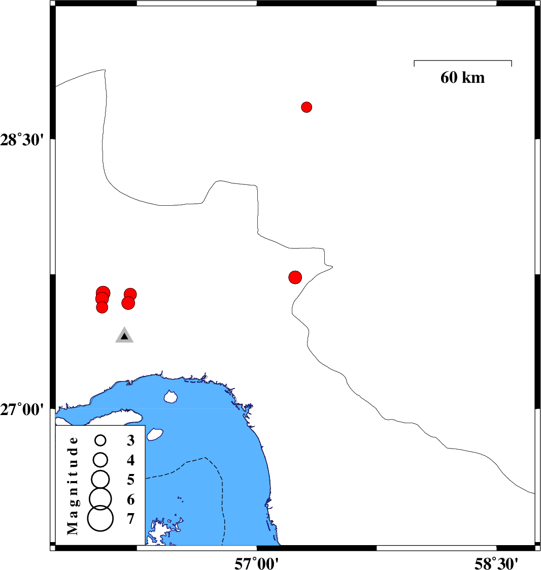 | 2022/04/27 | 19:30:12.2 | 00:00:12.2 | 27.732 | 57.24 | 14 | ML3.7 | Hormozgan Province, 34 km North of Dehbarez | ||