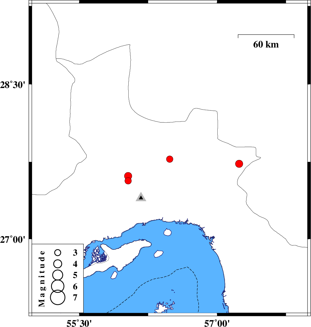 | 2022/04/27 | 19:30:12.2 | 00:00:12.2 | 27.732 | 57.24 | 14 | ML3.7 | Hormozgan Province, 34 km North of Dehbarez | ||