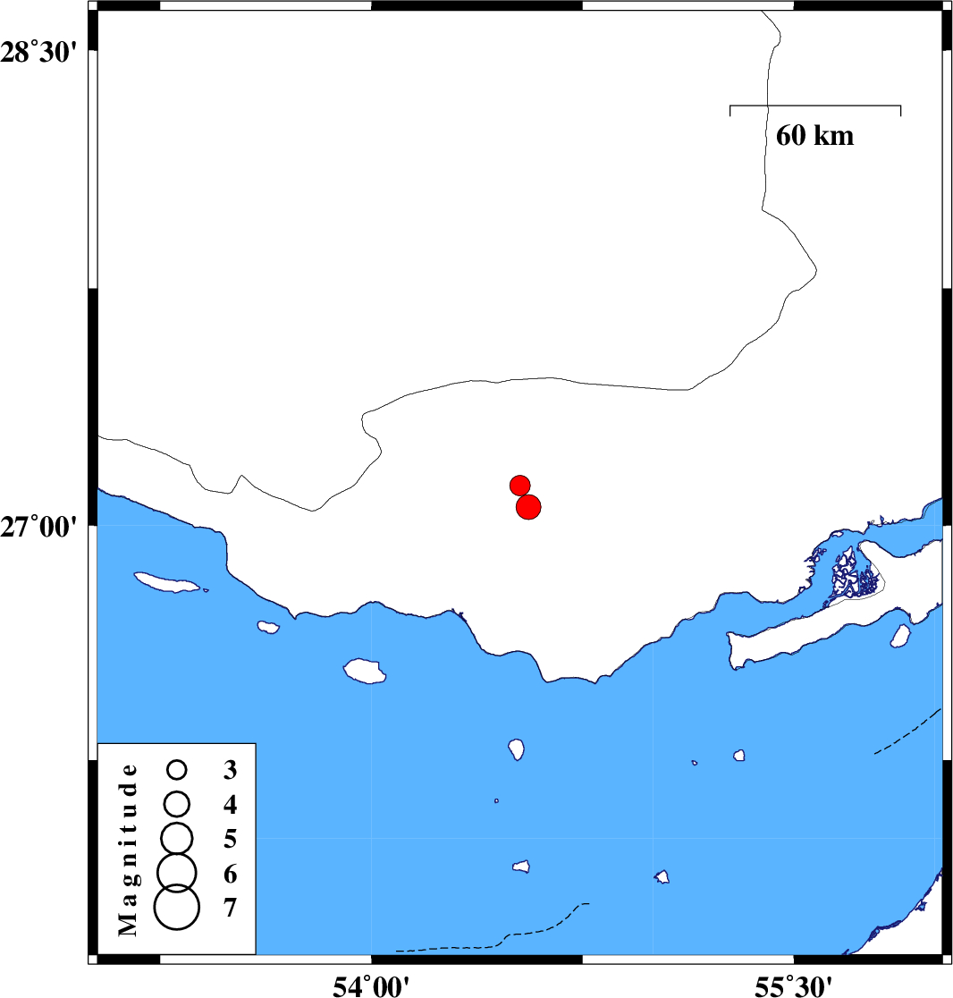 | 2022/04/30 | 20:05:52.4 | 00:35:52.4 | 27.058 | 54.557 | 21 | ML4 | Hormozgan Province, 25 km South-East of Bastak |