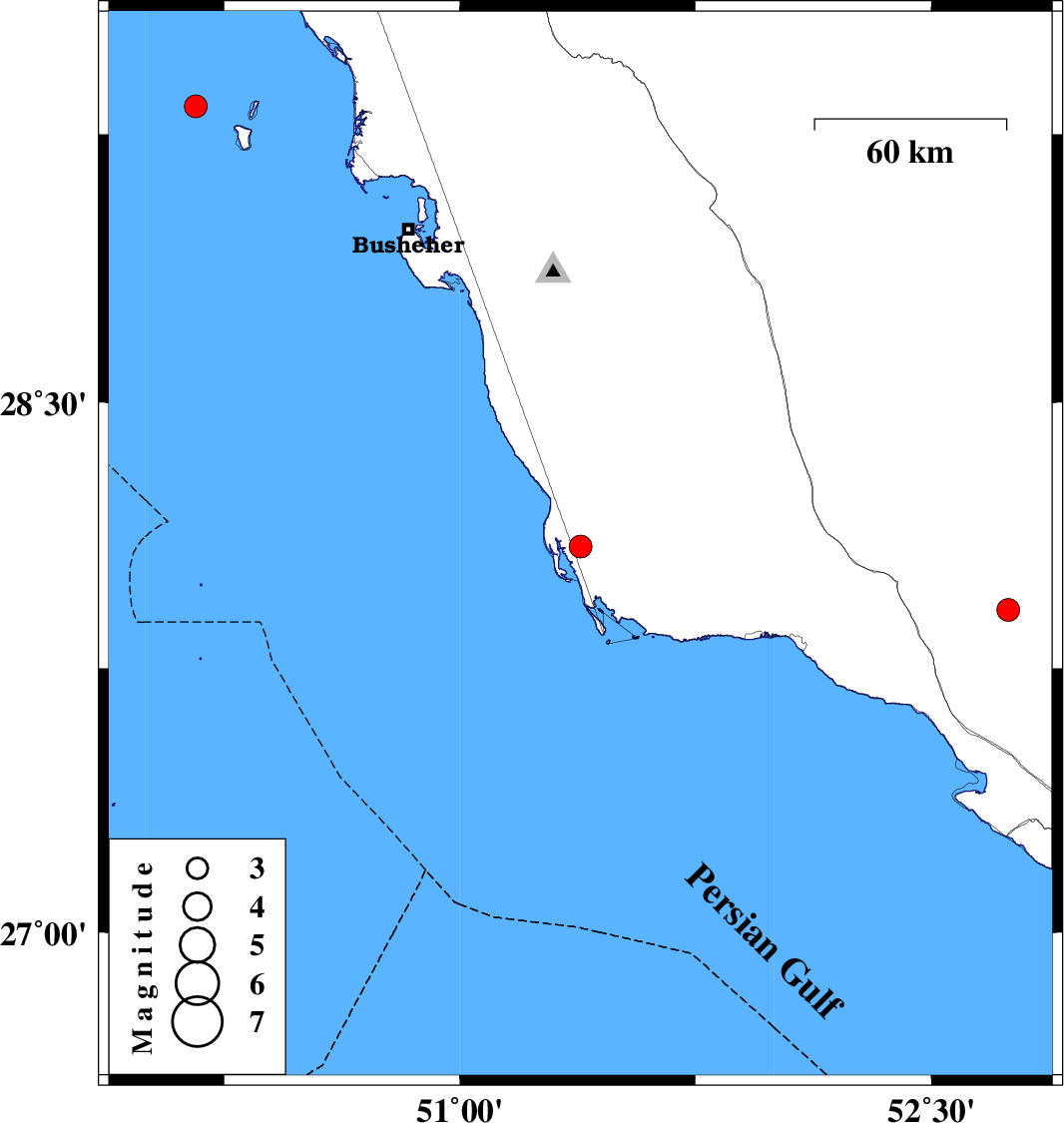 | 2022/04/11 | 08:43:44.6 | 13:13:44.6 | 29.328 | 50.16 | 9 | ML3.3 | Persian Gulf, 44 km South-West of Bandar-e genaveh |