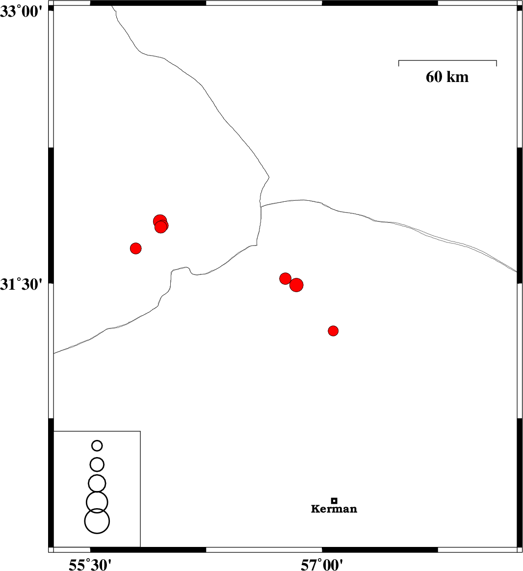 2022/05/15 | 12:44:01.4 | 17:14:01.4 | 31.491 | 56.834 | 12 | ML:3.9 | Kerman Province, 25 km North of Ravar | ||