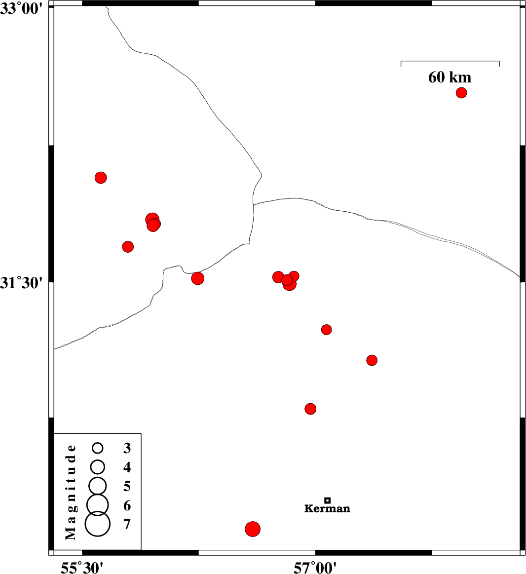 | 2022/05/15 | 12:44:01.4 | 17:14:01.4 | 31.491 | 56.834 | 12 | ML3.9 | Kerman Province, 25 km North of Ravar | ||