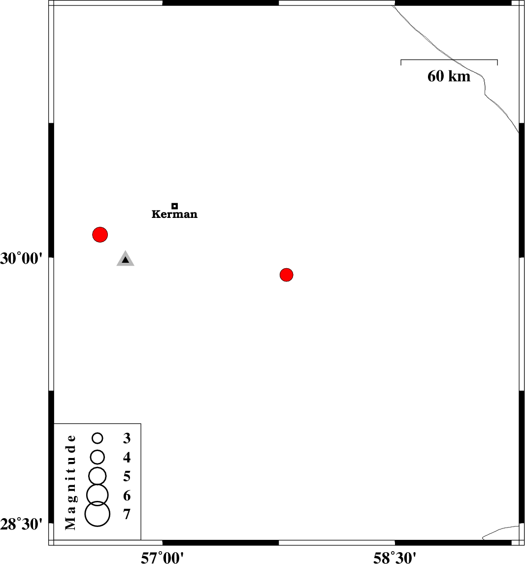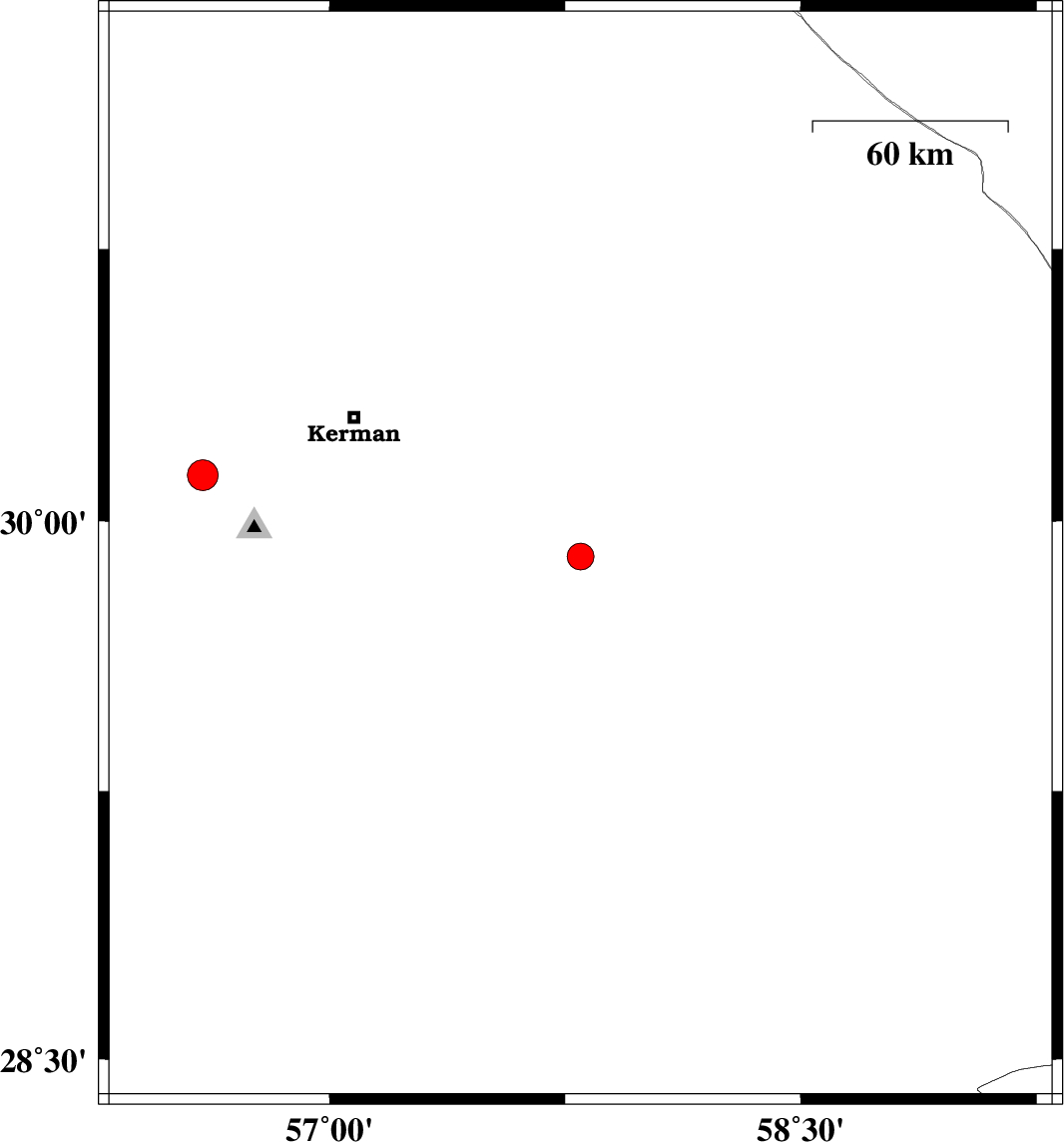 | 2022/05/17 | 21:35:11.8 | 02:05:11.8 | 30.128 | 56.598 | 12 | ML4.4 | Kerman Province, 23 km North of Bardsir |