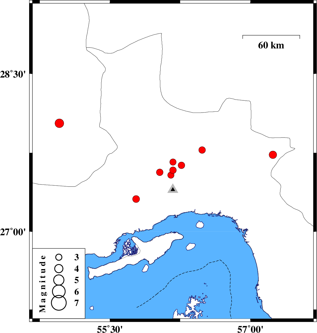 | 2022/04/27 | 19:30:12.2 | 00:00:12.2 | 27.732 | 57.24 | 14 | ML3.7 | Hormozgan Province, 34 km North of Dehbarez | ||