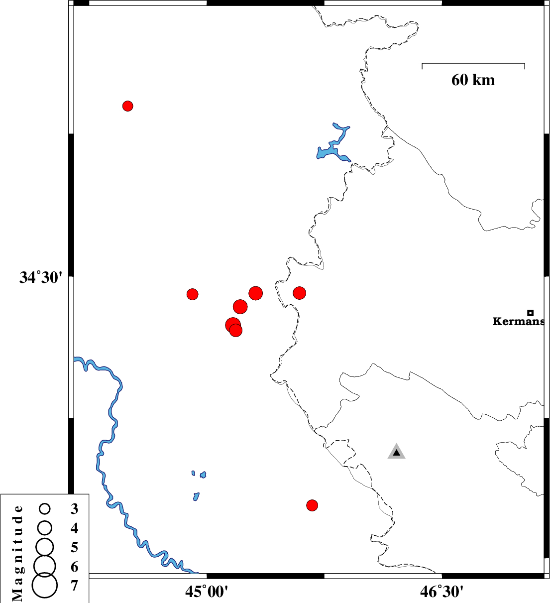 | 2022/05/13 | 16:42:45.3 | 21:12:45.3 | 34.614 | 46.057 | 12 | ML3.6 | Kermanshah Province, 23 km North-East of Sar-e pol-e zahab | ||
