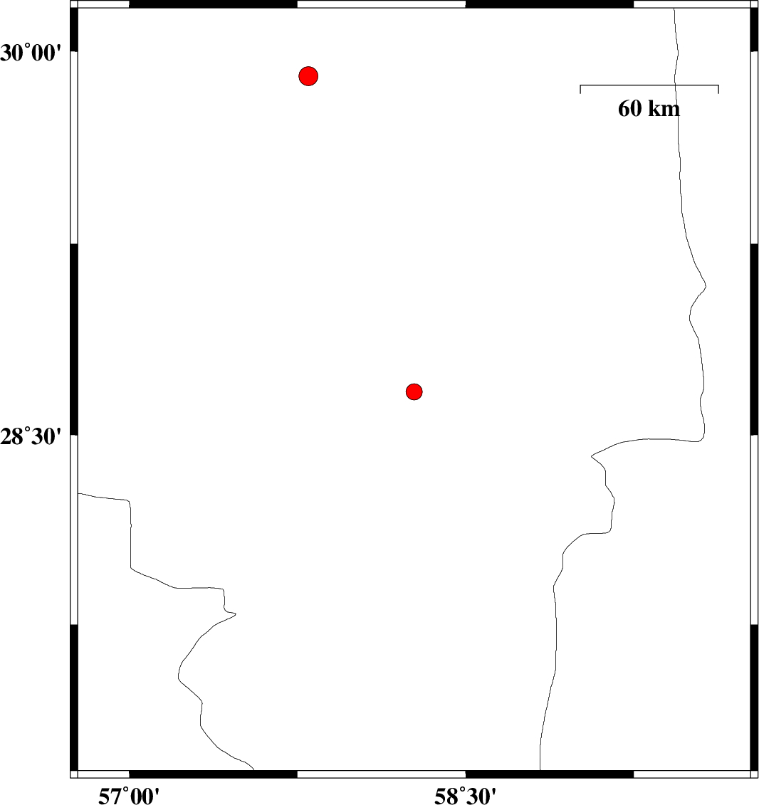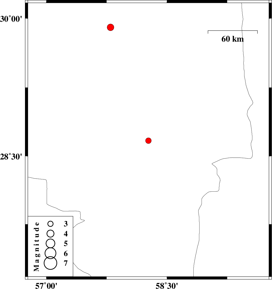 | 2022/05/20 | 15:48:06.5 | 20:18:06.5 | 29.903 | 57.799 | 12 | ML3.8 | Kerman Province, 81 km South-East of Kerman |