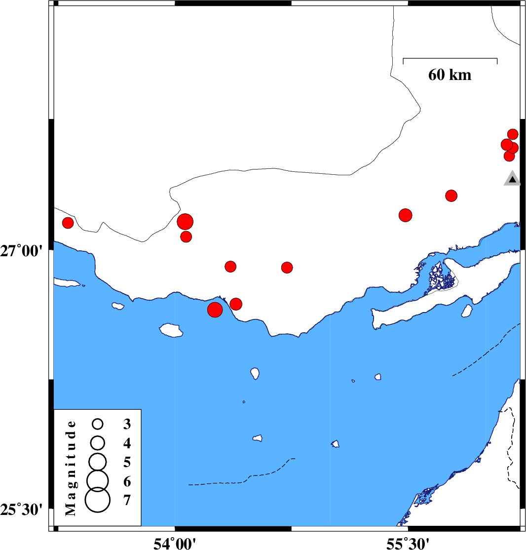 | 2022/06/14 | 14:09:42.1 | 18:39:42.1 | 26.654 | 54.258 | 12 | ML4.4 | Persian Gulf, 61 km South-West of Bastak | ||