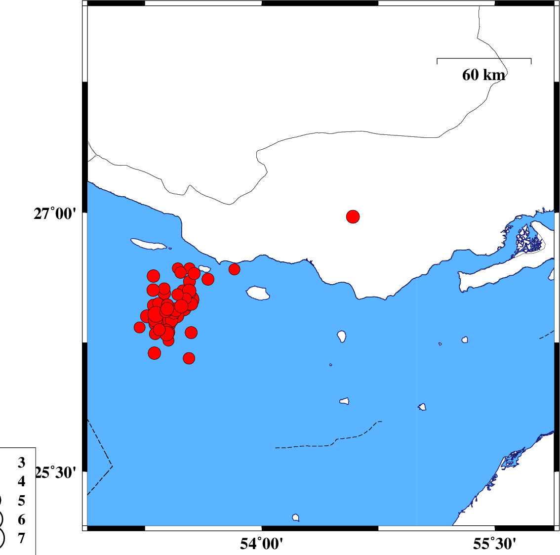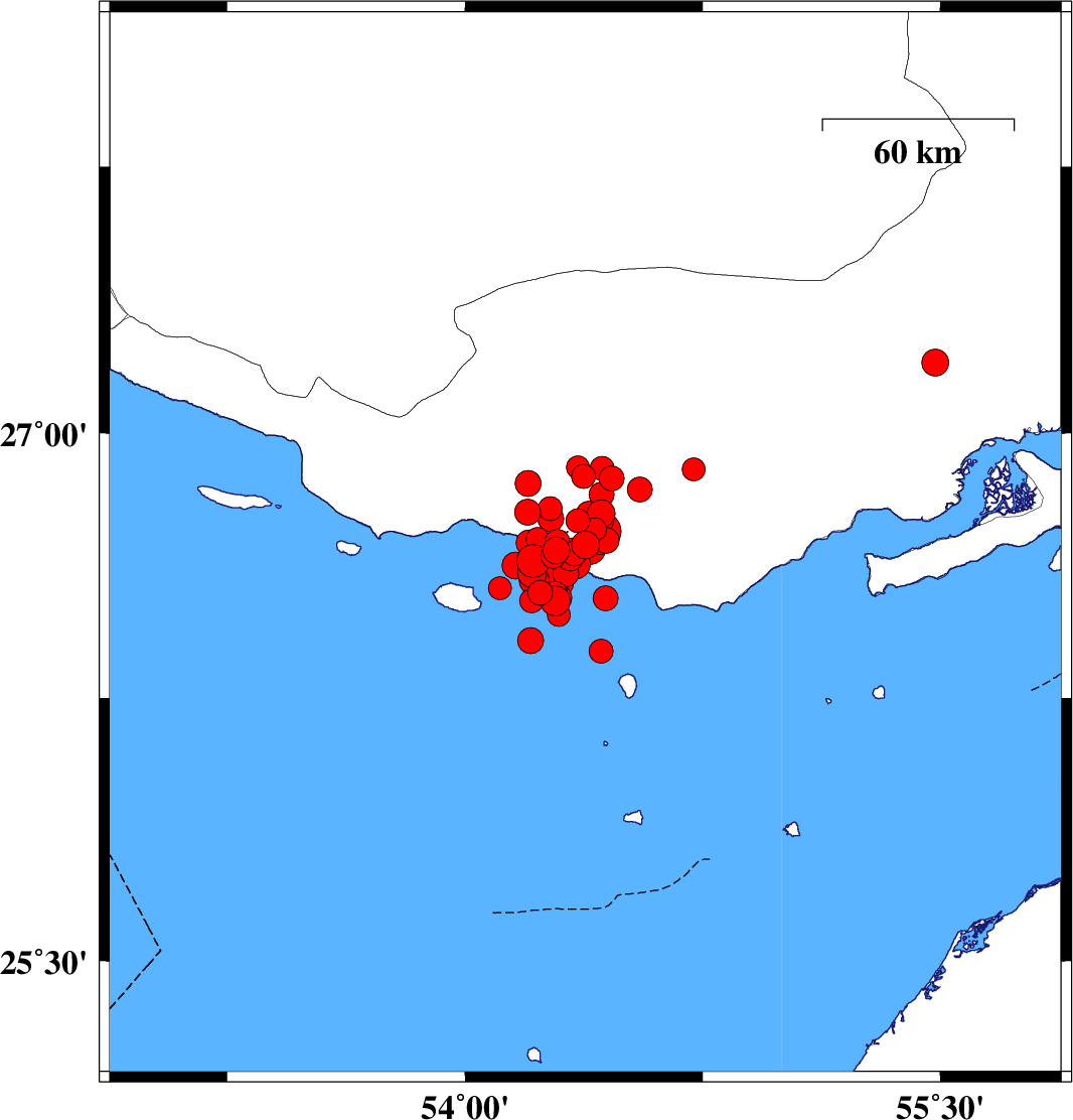 | 2022/06/16 | 00:40:46.7 | 05:10:46.7 | 26.638 | 54.215 | 12 | ML4.7 | Persian Gulf, 64 km South-West of Bastak | ||