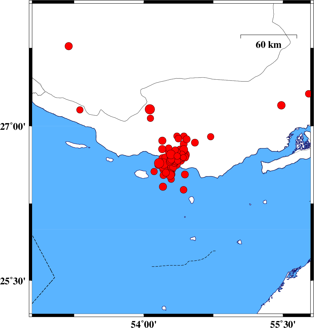 | 2022/06/16 | 20:53:11.2 | 01:23:11.2 | 26.659 | 54.345 | 20 | ML3.5 | Persian Gulf, 60 km South of Bastak | ||