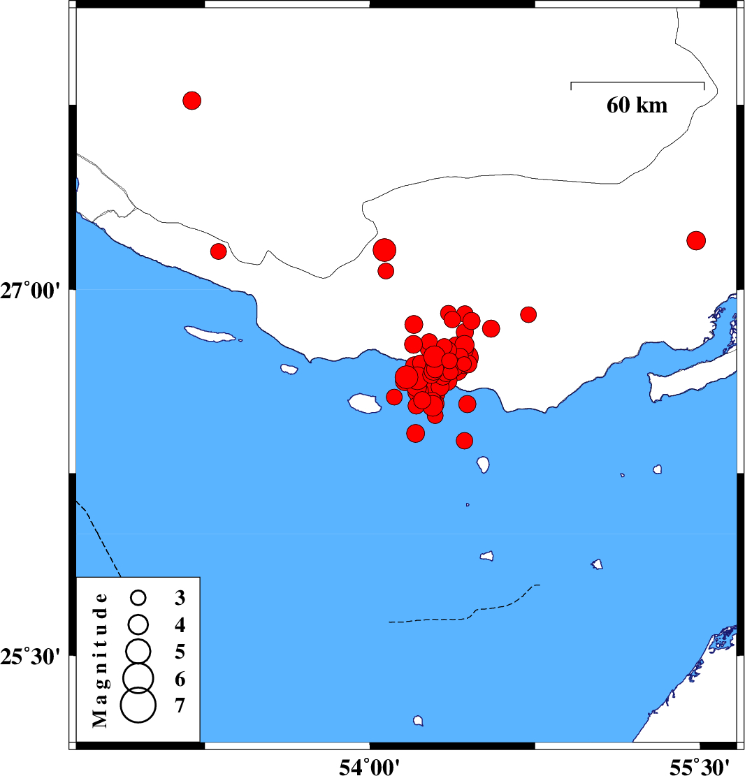 | 2022/06/16 | 20:53:11.2 | 01:23:11.2 | 26.659 | 54.345 | 20 | ML3.5 | Persian Gulf, 60 km South of Bastak | ||