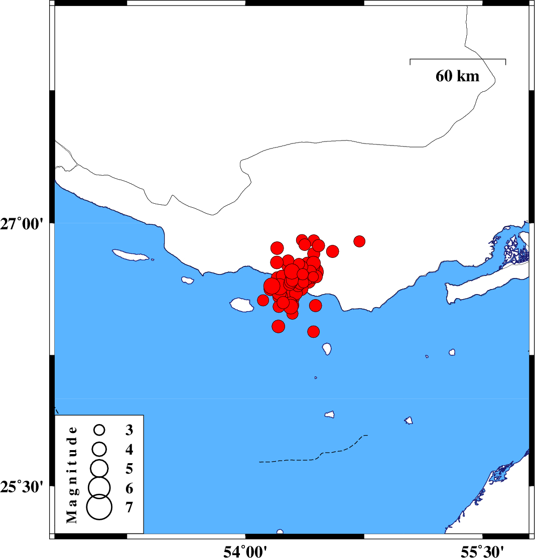 2022/06/16 00:40:46.7 05:10:46.7 26.63854.21512 ML4.7 Persian Gulf, 64 km South-West of Bastak