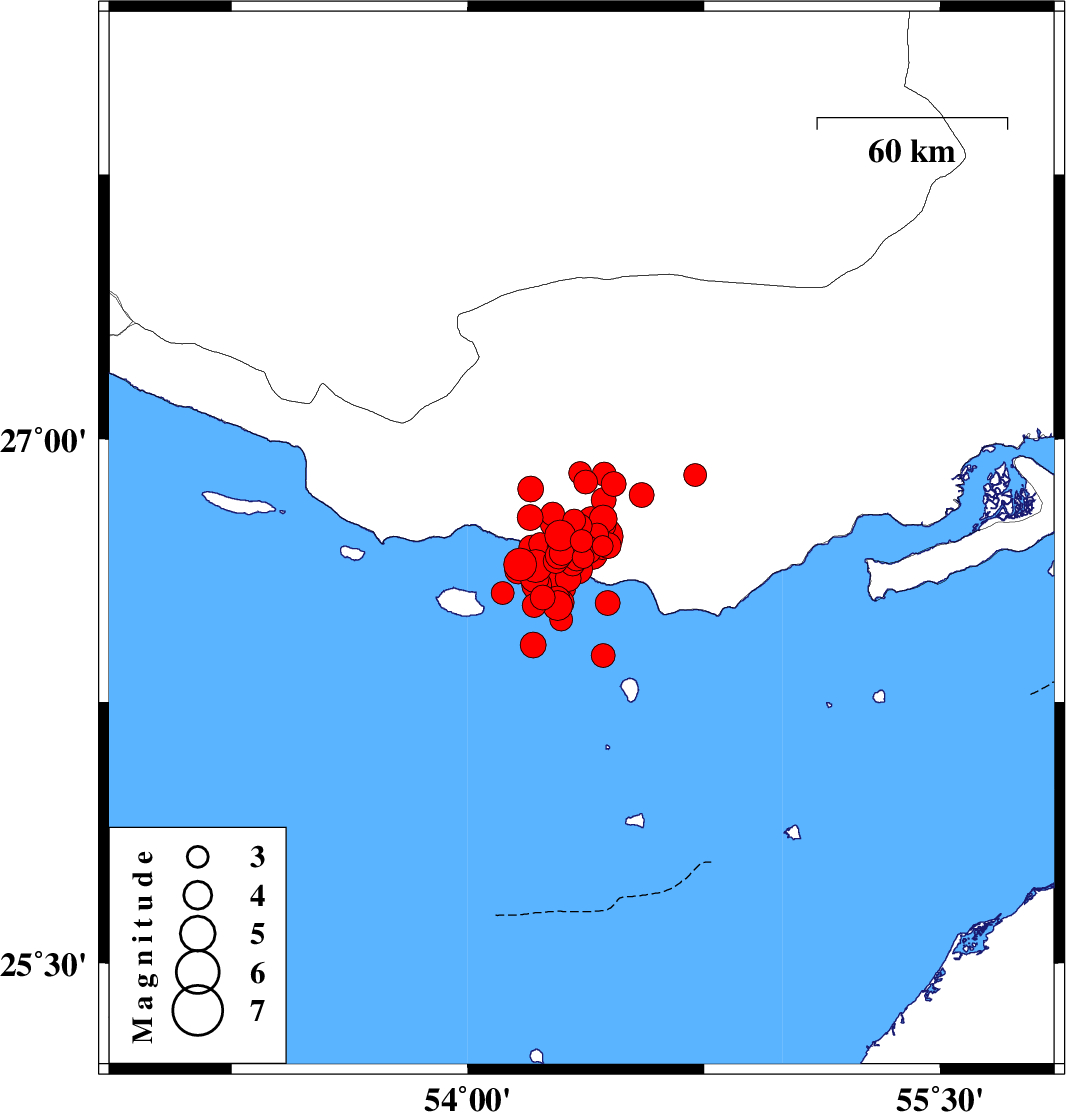 | 2022/06/16 | 00:40:46.7 | 05:10:46.7 | 26.638 | 54.215 | 12 | ML4.7 | Persian Gulf, 64 km South-West of Bastak | ||