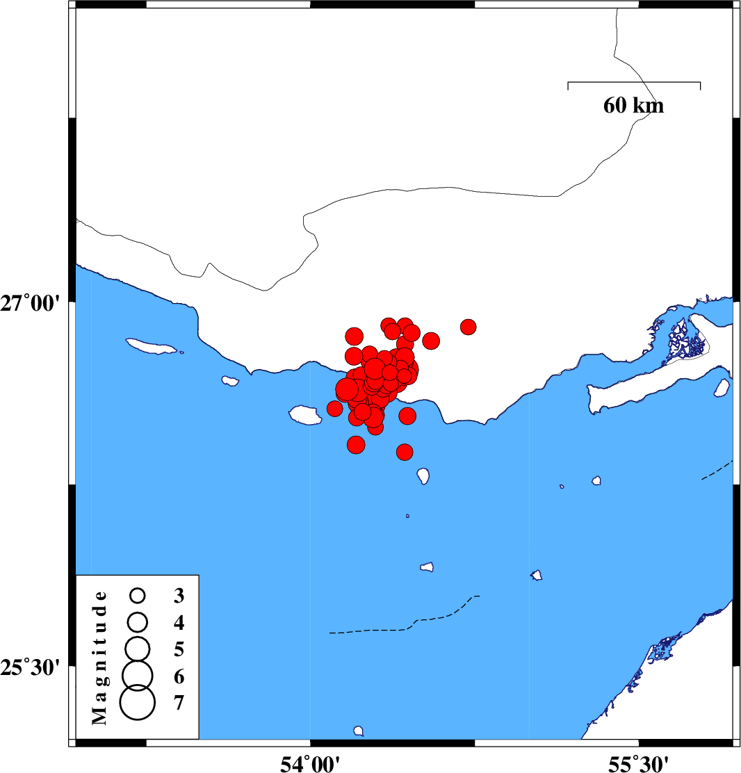 | 2022/06/16 | 00:40:46.7 | 05:10:46.7 | 26.638 | 54.215 | 12 | ML4.7 | Persian Gulf, 64 km South-West of Bastak | ||