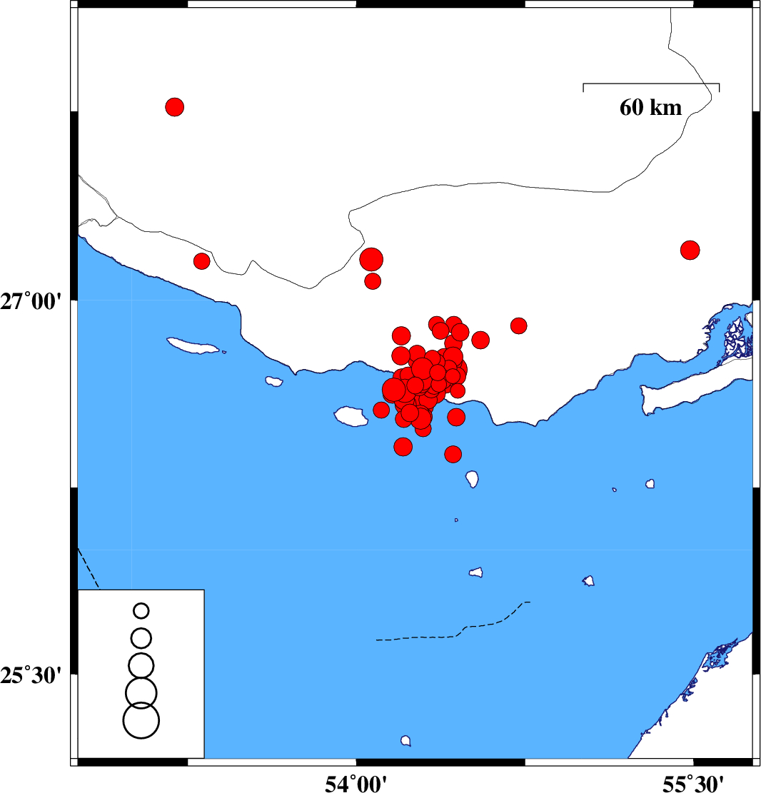 | 2022/06/16 | 00:40:46.7 | 05:10:46.7 | 26.638 | 54.215 | 12 | ML4.7 | Persian Gulf, 64 km South-West of Bastak | ||