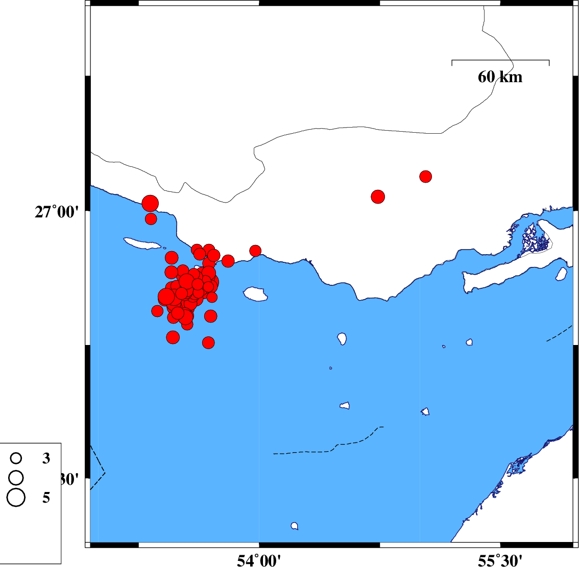 | 2022/06/16 | 20:53:11.2 | 01:23:11.2 | 26.659 | 54.345 | 20 | ML3.5 | Persian Gulf, 60 km South of Bastak | ||