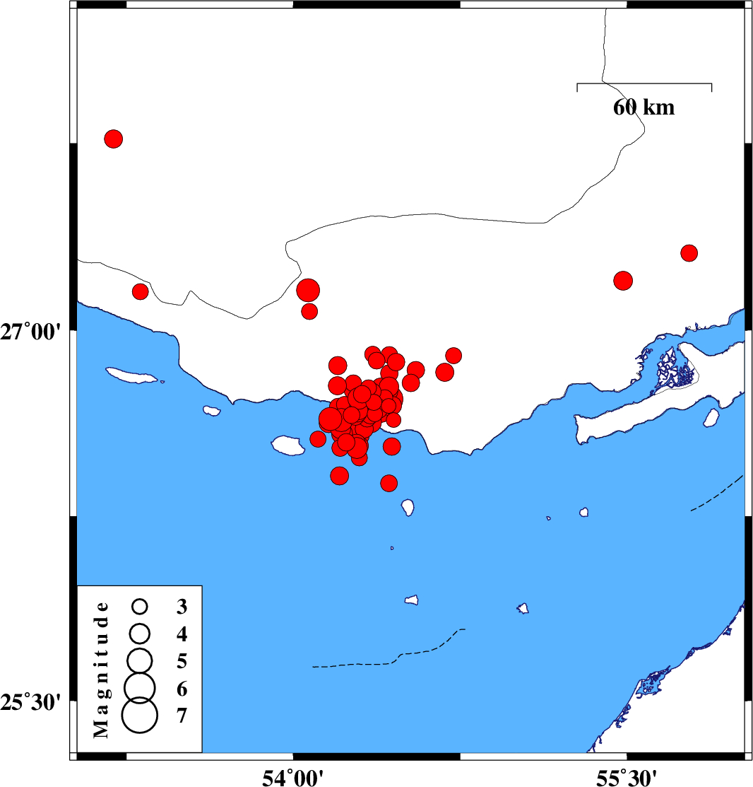 | 2022/06/16 | 20:53:11.2 | 01:23:11.2 | 26.659 | 54.345 | 20 | ML3.5 | Persian Gulf, 60 km South of Bastak | ||