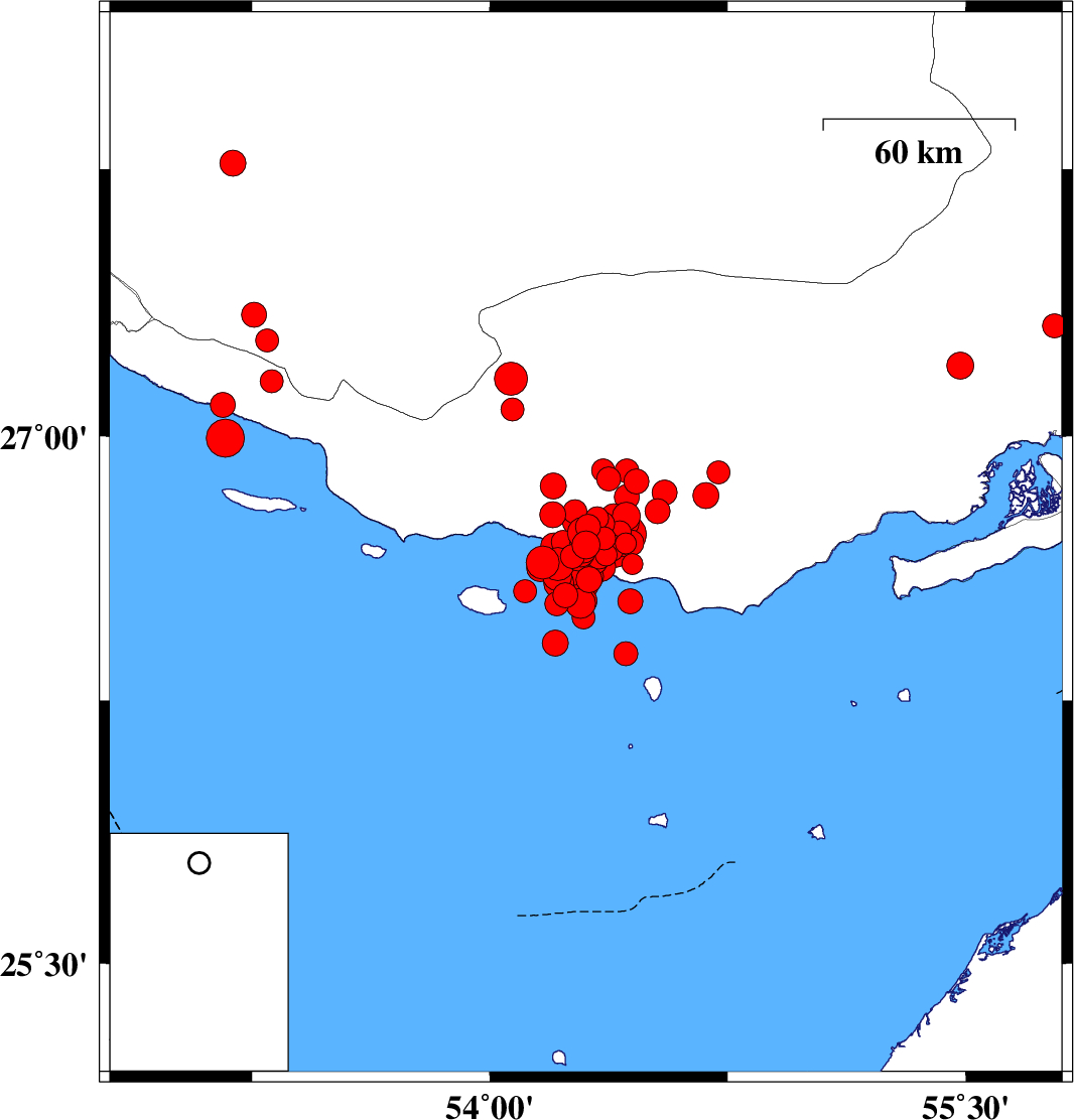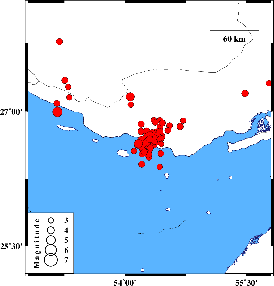 | 2022/06/21 | 07:05:05.4 | 11:35:05.4 | 26.692 | 54.303 | 19 | ML4 | Persian Gulf, 57 km South of Bastak | ||