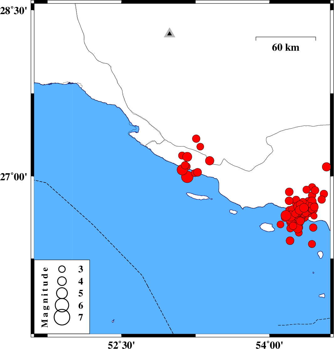 | 2022/06/21 | 07:05:05.4 | 11:35:05.4 | 26.692 | 54.303 | 19 | ML4 | Persian Gulf, 57 km South of Bastak | ||