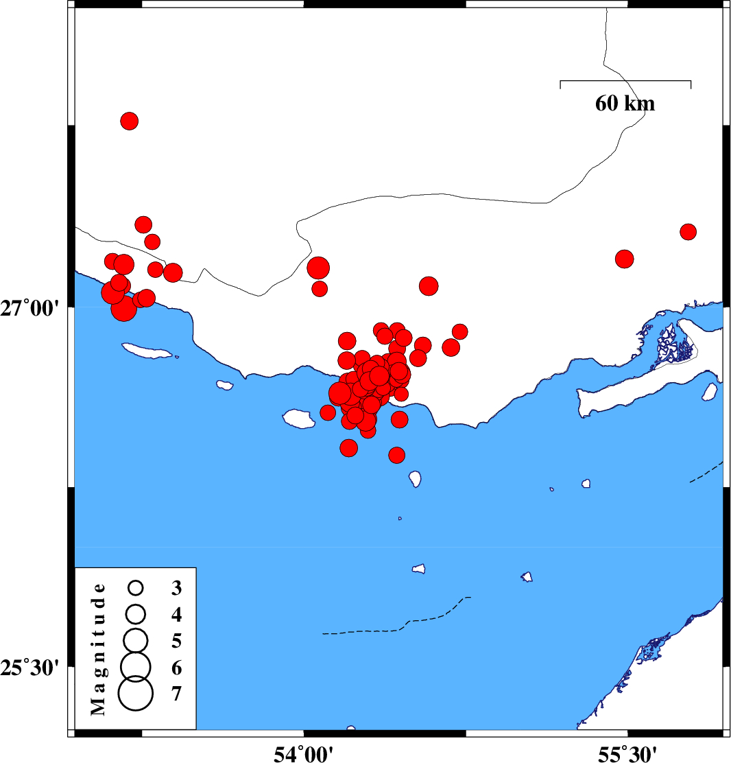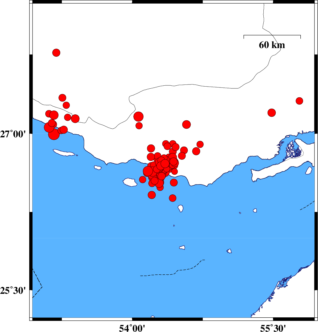| 2022/06/21 | 07:05:05.4 | 11:35:05.4 | 26.692 | 54.303 | 19 | ML4 | Persian Gulf, 57 km South of Bastak | ||