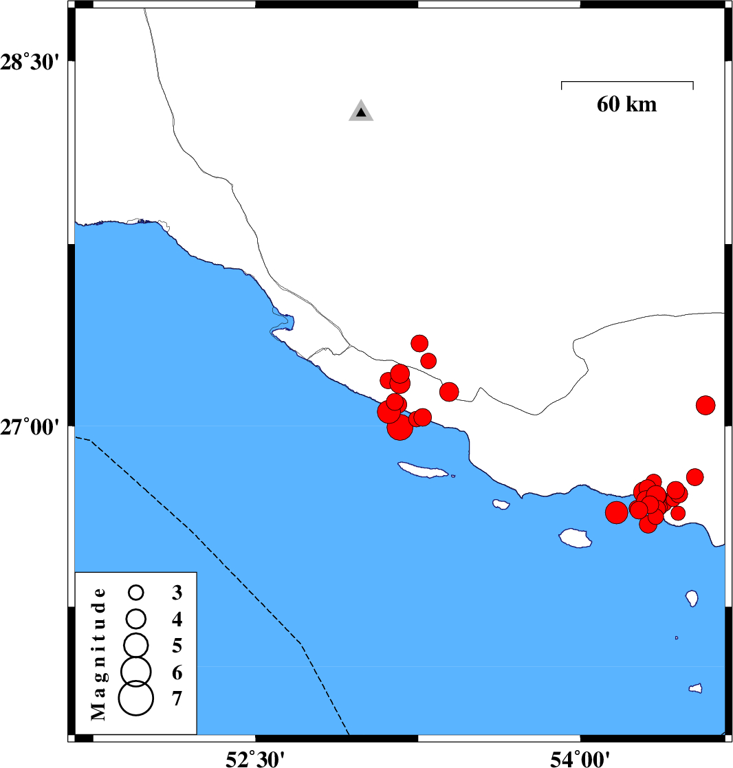 | 2022/06/19 | 09:24:06.4 | 13:54:06.4 | 26.659 | 54.261 | 12 | ML3.4 | Persian Gulf, 61 km South-West of Bastak | ||