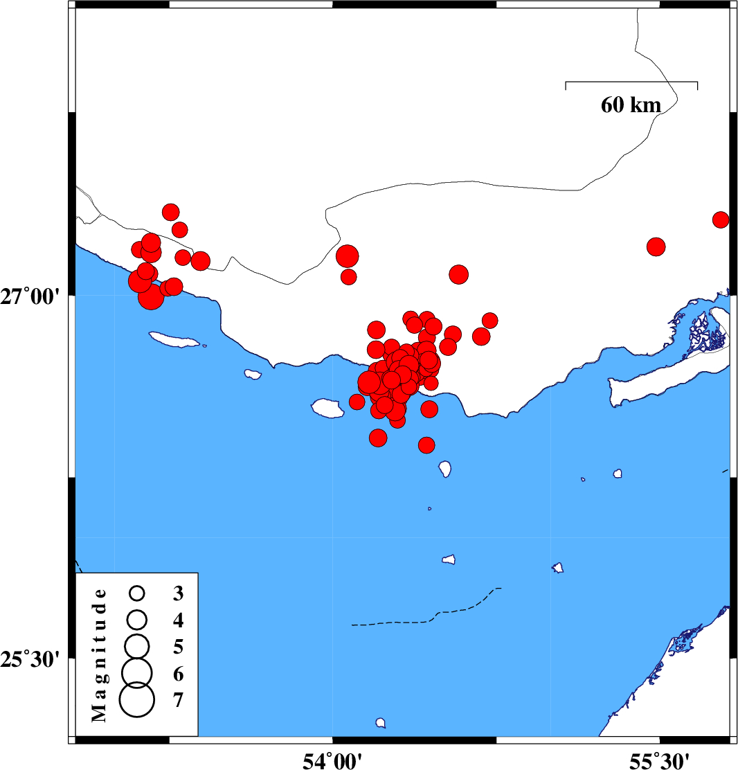 2022/06/16 00:40:46.7 05:10:46.7 26.63854.21512 ML4.7 Persian Gulf, 64 km South-West of Bastak