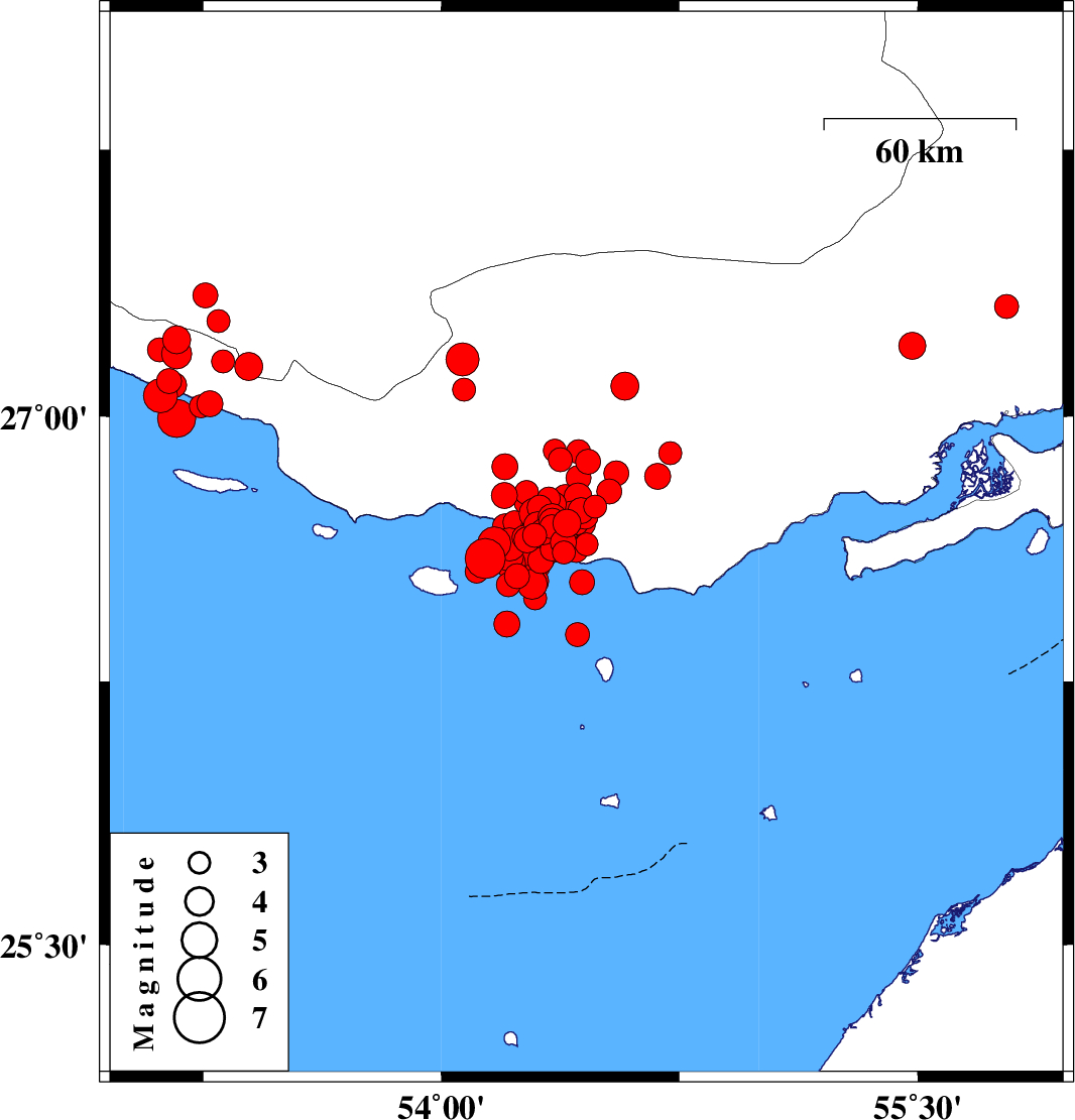 2022/06/16 00:40:46.7 05:10:46.7 26.63854.21512 ML4.7 Persian Gulf, 64 km South-West of Bastak