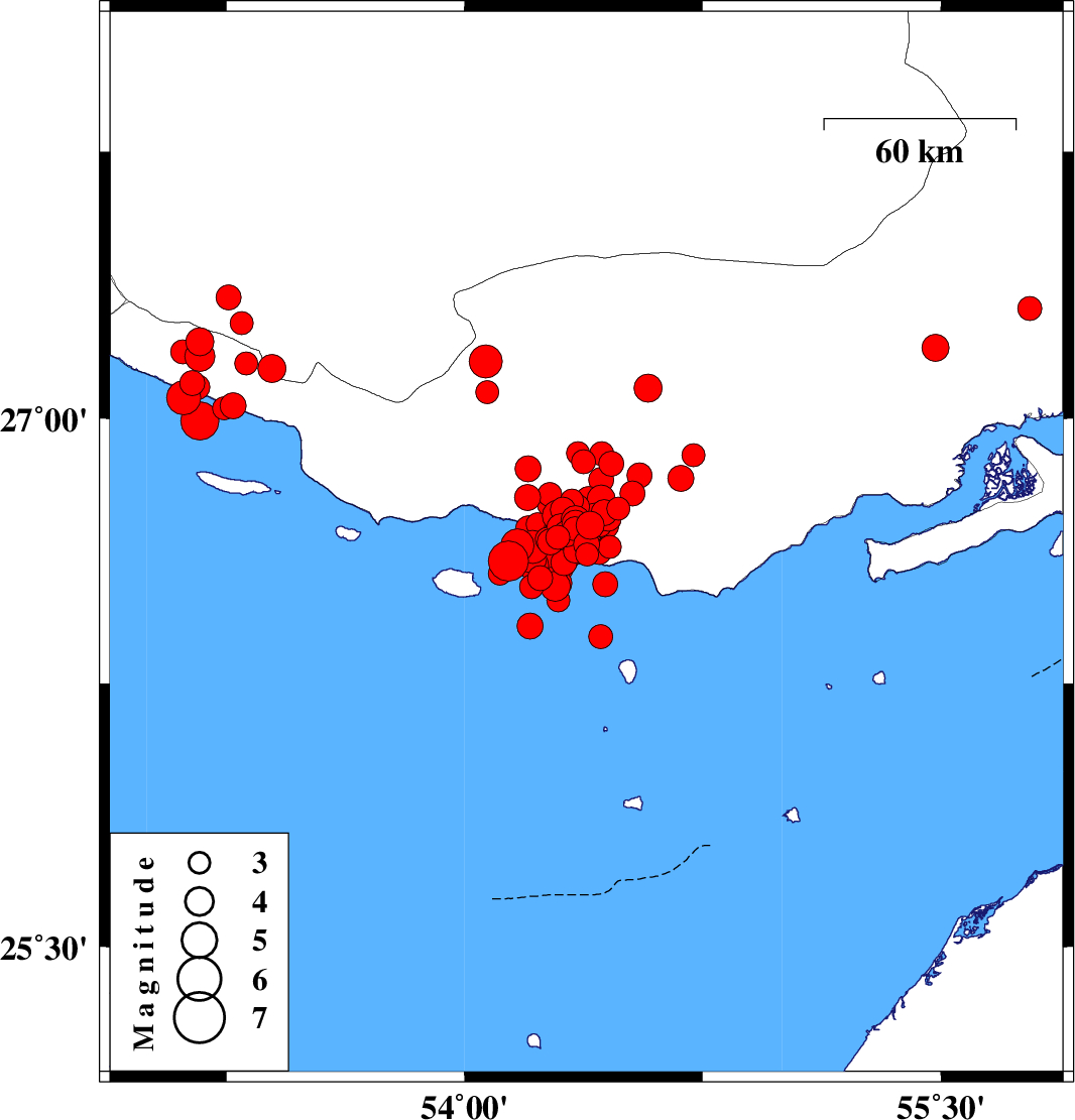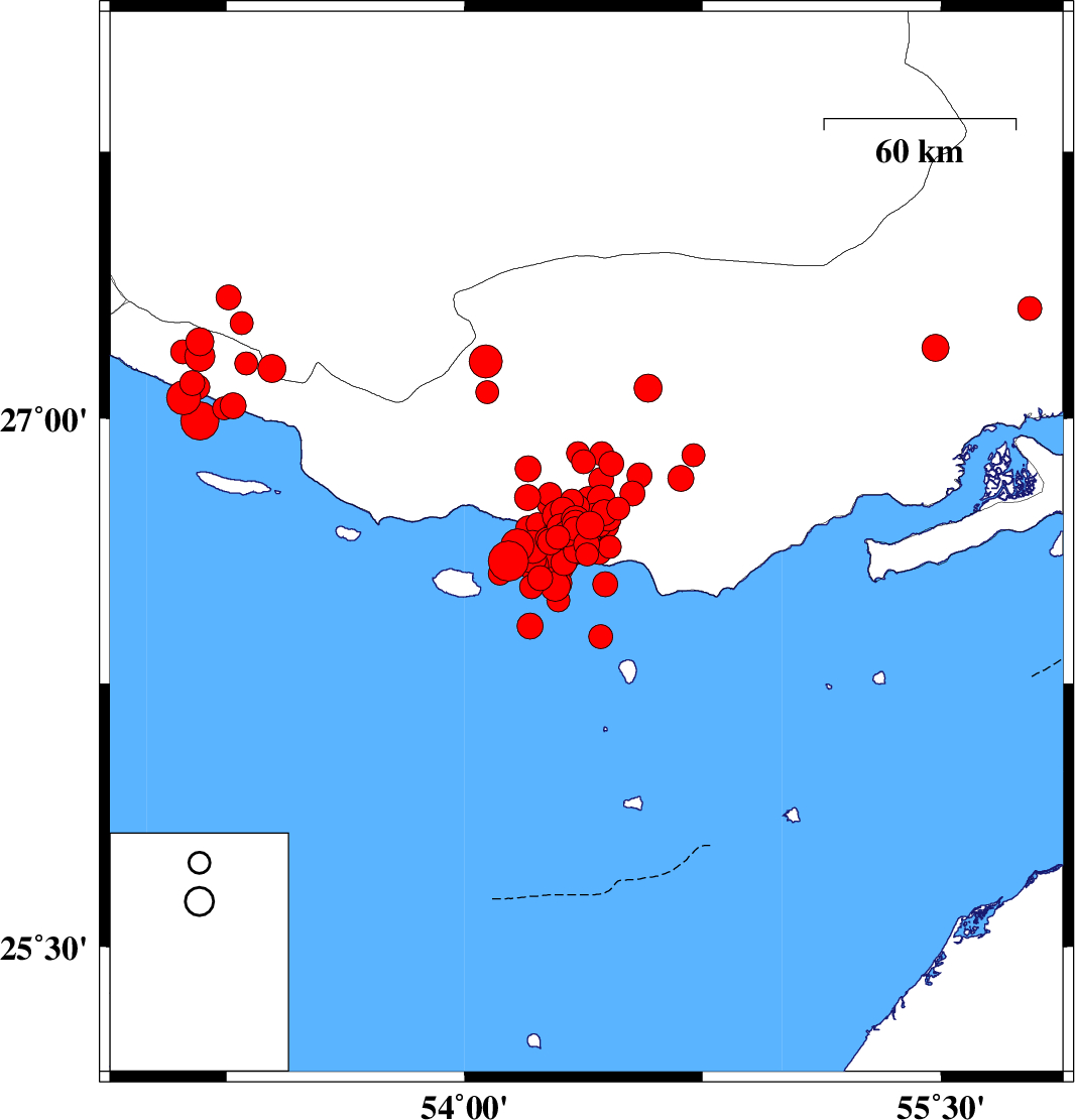| 2022/06/21 | 07:05:05.4 | 11:35:05.4 | 26.692 | 54.303 | 19 | ML4 | Persian Gulf, 57 km South of Bastak | ||