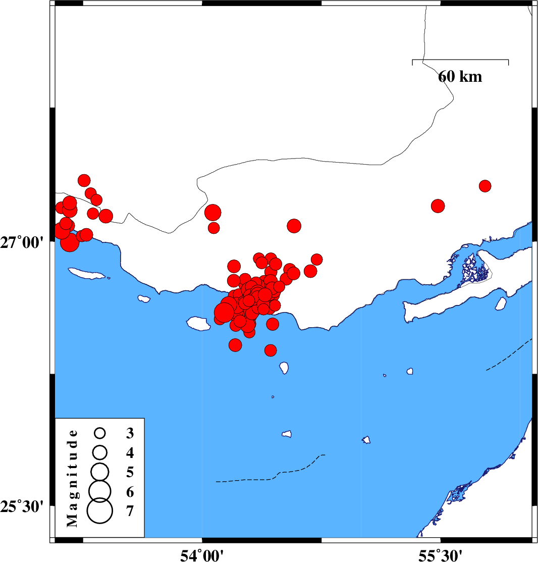 | 2022/06/21 | 07:05:05.4 | 11:35:05.4 | 26.692 | 54.303 | 19 | ML4 | Persian Gulf, 57 km South of Bastak | ||